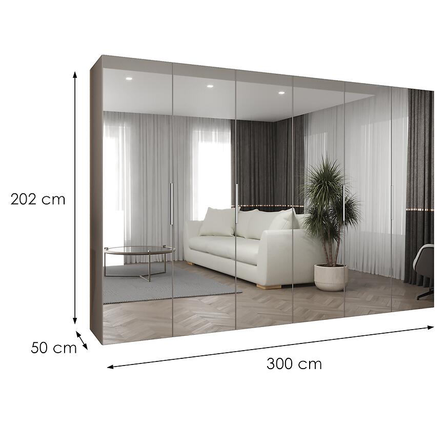 Dzięki wymiarom 300 cm szerokości, 202 cm wysokości i 50 cm głębokości, szafa zapewnia dużą przestrzeń do przechowywania ubrań, dodatków i tekstyliów, jednocześnie zachowując estetyczny wygląd.