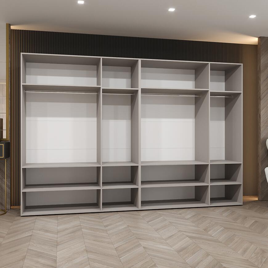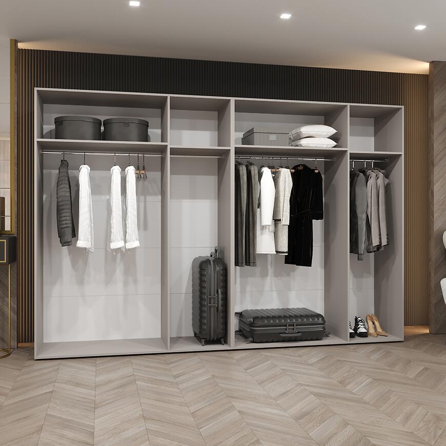Brak wbudowanego oświetlenia podkreśla minimalistyczny charakter szafy, a możliwość dopasowania własnego oświetlenia pozwala na indywidualne aranżacje.