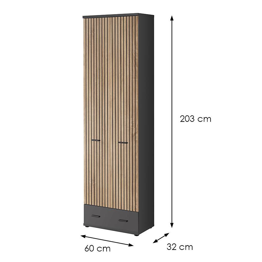 Szafa wykonana jest z trwałej płyty wiórowej laminowanej, co zapewnia jej długotrwałą wytrzymałość. Wykończenie w matowym kolorze antracyt/artisan nadaje jej elegancki wygląd, który doskonale komponuje się z nowoczesnym stylem wnętrza.