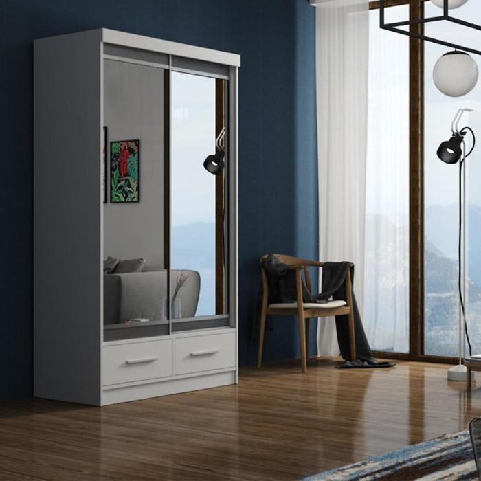 Szafa przesuwna w kolorze biały/szary to propozycja do pokoju dziennego, ale znajdzie swoje miejsce również w innym pomieszczeniu, jak na przykład - przedpokój czy garderobie. Materiał wykonania to płyta laminowana. Szafa posiada półki, szuflady oraz drążek na ubrania. Mebel posiada lustro, które sprawi, że pomieszczenie stanie się optycznie większe. Nowoczesny styl mebli wpadnie do gustu każdemu, kto poszukuje eleganckiego, klasycznego, a zarazem nowoczesnego umeblowania. Idealnie wpasuje się w większość aranżacji. Przeznaczona do samodzielnego montażu. Mebel do samodzielnego montażu.