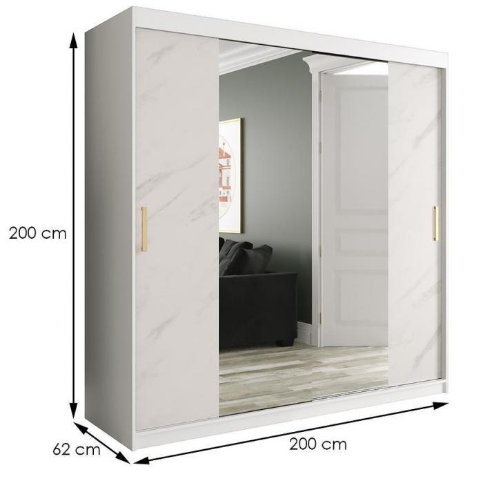 Szafa z drzwiami przesuwnymi Marmur to doskonały wybór do garderoby, przedpokoju, salonu czy sypialni. Kolor frontów i korpusu sprawiają, że wpasuje się w większość aranżacji. Jej wnętrze jest pojemne i pomieści zarówno ubrania jak i inne akcesoria. Szafa jest 2-drzwiowa oraz posiada lustro, które optycznie powiększy pomieszczenie.