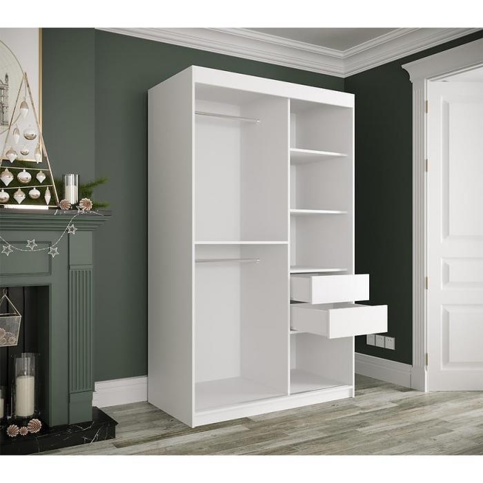 Szafa z drzwiami przesuwnymi Marmur to doskonały wybór do garderoby, przedpokoju, salonu czy sypialni. Kolor frontów i korpusu sprawiają, że wpasuje się w większość aranżacji. Jej wnętrze jest pojemne i pomieści zarówno ubrania jak i inne akcesoria. Szafa jest 2-drzwiowa oraz posiada lustro, które optycznie powiększy pomieszczenie.