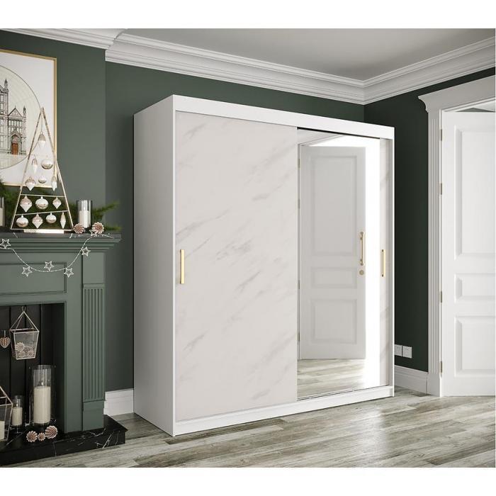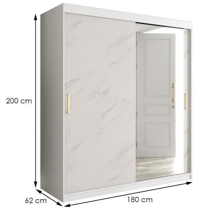 Szafa z drzwiami przesuwnymi Marmur to doskonały wybór do garderoby, przedpokoju, salonu czy sypialni. Kolor frontów i korpusu sprawiają, że wpasuje się w większość aranżacji. Jej wnętrze jest pojemne i pomieści zarówno ubrania jak i inne akcesoria. Szafa jest 2-drzwiowa oraz posiada lustro, które optycznie powiększy pomieszczenie.