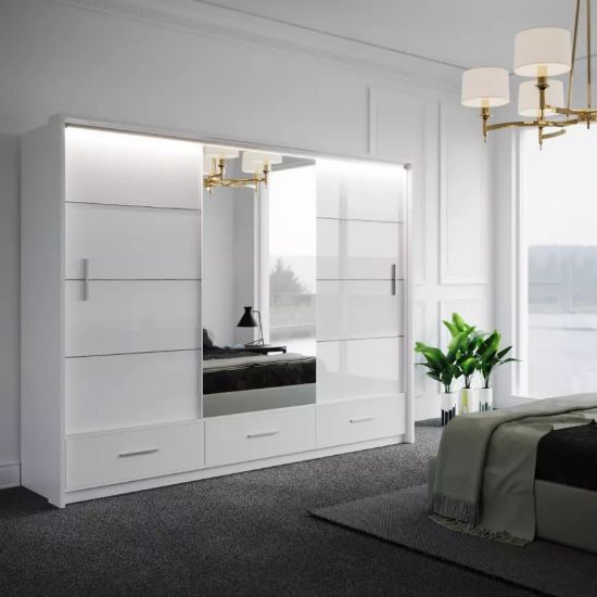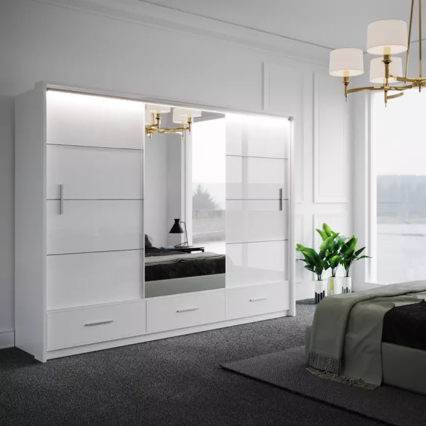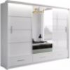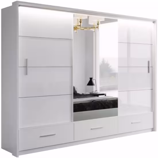 Szafa w kolorze białym z kolekcji Marsylia to doskonała propozycja do pokoju dziennego, ale znajdzie swoje miejsce również w innym pomieszczeniu, jak na przykład - przedpokój czy garderobie, sypialni. Materiał wykonania to płyta laminowana. Szafa posiada półki, drążek na ubrania oraz szuflady. Dodatkowym atutem jest oświetlenie w zestawie. Duża szafa posiada również lustro, które sprawi, że pomieszczenie stanie się optycznie większe. Szafa będzie świetnym miejscem do wieszania ubrań, na buty lub inne domowe tekstylia. Nowoczesny styl mebli wpadnie do gustu każdemu, kto poszukuje eleganckiego, klasycznego, a zarazem nowoczesnego umeblowania. Idealnie wpasuje się w większość aranżacji. Szafa przeznaczona do samodzielnego montażu.