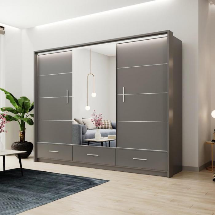 Szafa w kolorze grafit z kolekcji Marsylia to doskonała propozycja do pokoju dziennego, ale znajdzie swoje miejsce również w innym pomieszczeniu, jak na przykład - przedpokój czy garderobie, sypialni. Materiał wykonania to płyta laminowana. Szafa posiada półki, drążek na ubrania oraz szuflady. Dodatkowym atutem jest oświetlenie w zestawie. Duża szafa posiada również lustro, które sprawi, że pomieszczenie stanie się optycznie większe. Szafa będzie świetnym miejscem do wieszania ubrań, na buty lub inne domowe tekstylia. Nowoczesny styl mebli wpadnie do gustu każdemu, kto poszukuje eleganckiego, klasycznego, a zarazem nowoczesnego umeblowania. Idealnie wpasuje się w większość aranżacji. Szafa przeznaczona do samodzielnego montażu.