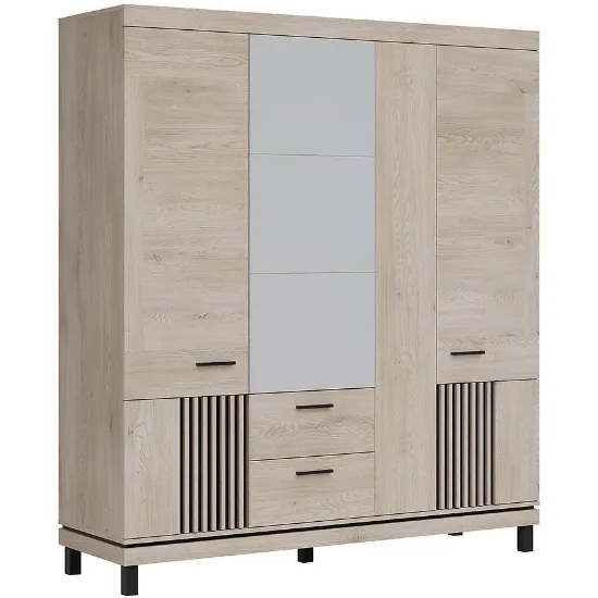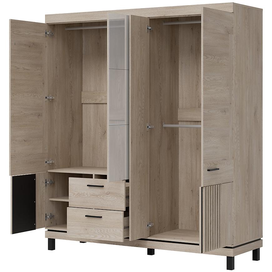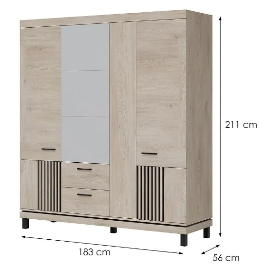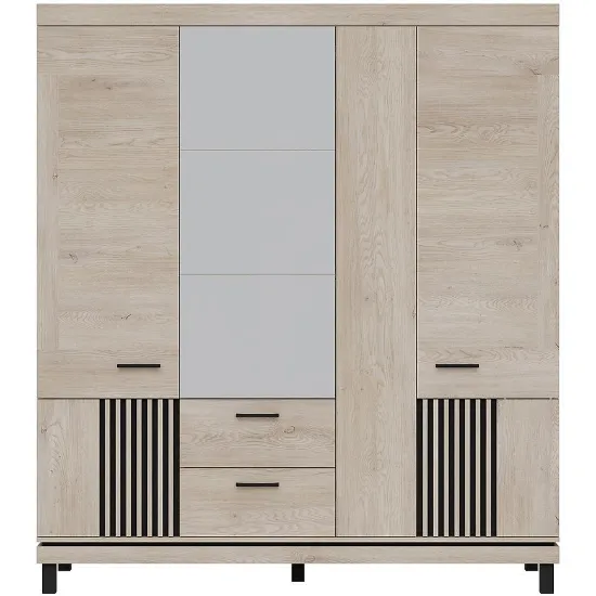 Szafa MATI to idealne rozwiązanie dla osób poszukujących stylowego i funkcjonalnego mebla do sypialni, garderoby lub przedpokoju. Jej nowoczesny design łączy klasyczne czterodrzwiowe skrzydła z praktycznym lustrem, które optycznie powiększa przestrzeń i dodaje wnętrzu elegancji. Połączenie kolorystyki dąb cremona cotta z głęboką czernią w matowym wykończeniu nadaje szafie wyjątkowy charakter, doskonale komponując się z nowoczesnymi aranżacjami.