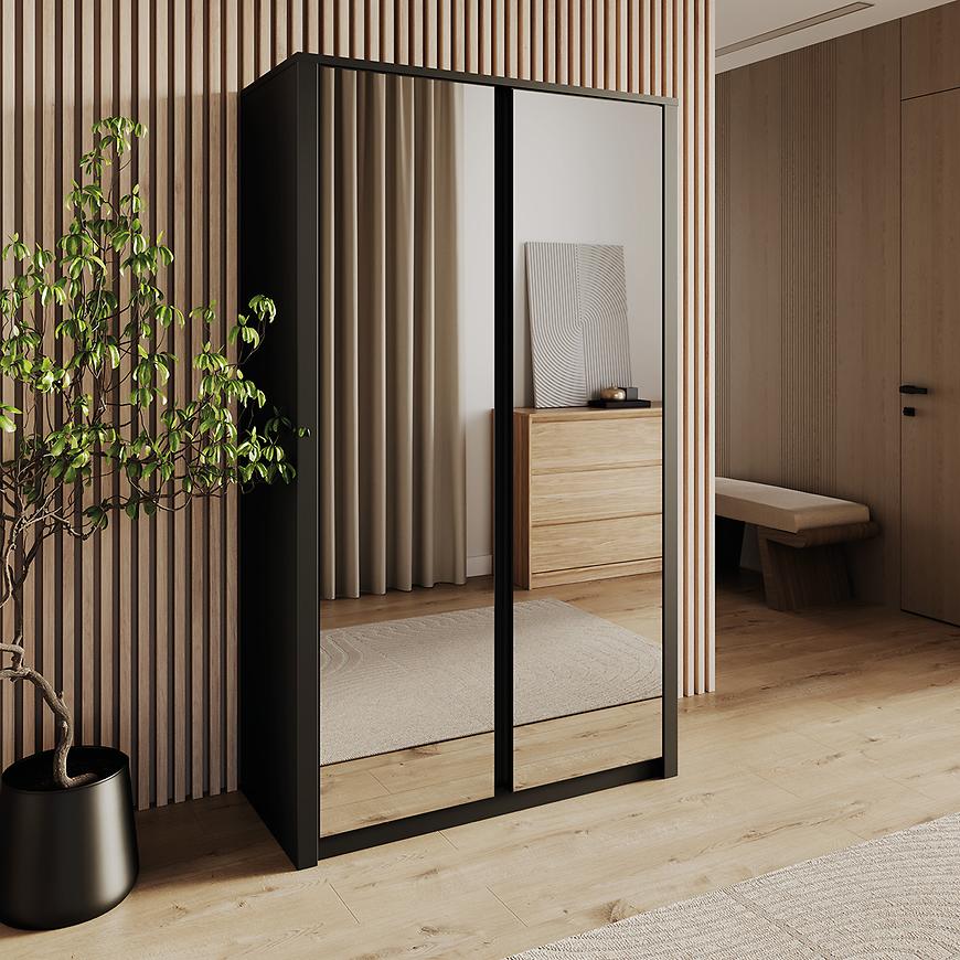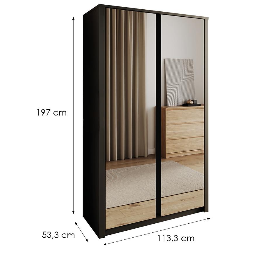 Ten model z kolekcji MAXIM wyróżnia się eleganckim wyglądem i solidnym wykonaniem. Dwudrzwiowa konstrukcja z klasycznymi drzwiami oraz duże lustro na froncie sprawiają, że szafa optycznie powiększa przestrzeń i wprowadza do wnętrza więcej światła.