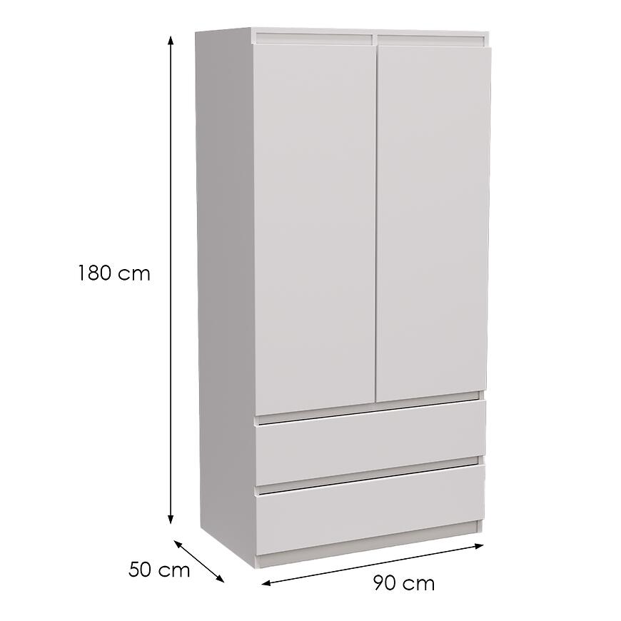 Szafa Merg biały to nowoczesny, dwudrzwiowy mebel o prostym, eleganckim designie. Wykonana z trwałej płyty laminowanej w kolorze białym z matowym wykończeniem, łączy estetykę z funkcjonalnością. Przemyślana konstrukcja zapewnia wygodne przechowywanie ubrań i akcesoriów, a minimalistyczny styl sprawia, że szafa harmonijnie wpisuje się w różne aranżacje wnętrz.