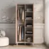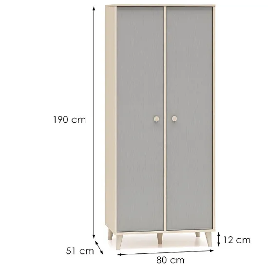 Mebel ma wymiary 80 cm szerokości, 190 cm wysokości i 51 cm głębokości, co sprawia, że jest odpowiedni do mniejszych przestrzeni. Wnętrze szafy zostało zaprojektowane z myślą o maksymalnej funkcjonalności: wyposażono ją w dwa drążki na ubrania oraz pięć półek, co pozwala na wygodne przechowywanie odzieży i akcesoriów.