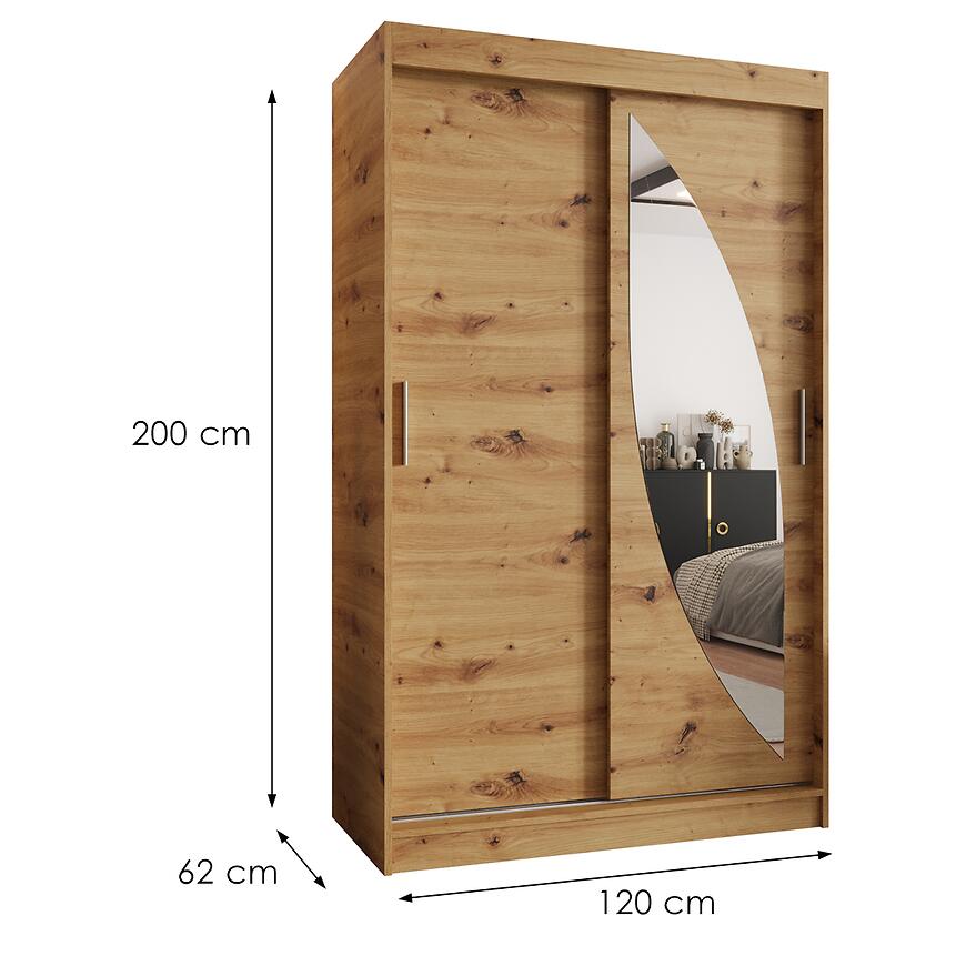 Szafa ma 120 cm szerokości, 200 cm wysokości i 62 cm głębokości, co zapewnia dużą powierzchnię do przechowywania odzieży, dodatków czy pościeli. Wnętrze można dowolnie zorganizować, wstawiając wieszaki, półki lub pojemniki, w zależności od potrzeb. Dzięki temu mebel staje się praktycznym elementem każdego pomieszczenia, łącząc funkcję przechowywania z estetyką.