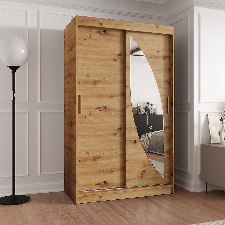 Szafa Milo 120 artisan to wyjątkowy mebel, który łączy nowoczesny design z praktycznymi rozwiązaniami do przechowywania. Jej jasne, drewnopodobne wybarwienie w kolorze artisan wprowadza do wnętrza naturalny i przytulny klimat, a matowe wykończenie frontów i korpusu nadaje lekkości i subtelnej elegancji. Wbudowane lustro nie tylko pomaga w codziennej kontroli wyglądu, ale także optycznie powiększa przestrzeń, dodając wnętrzu głębi.