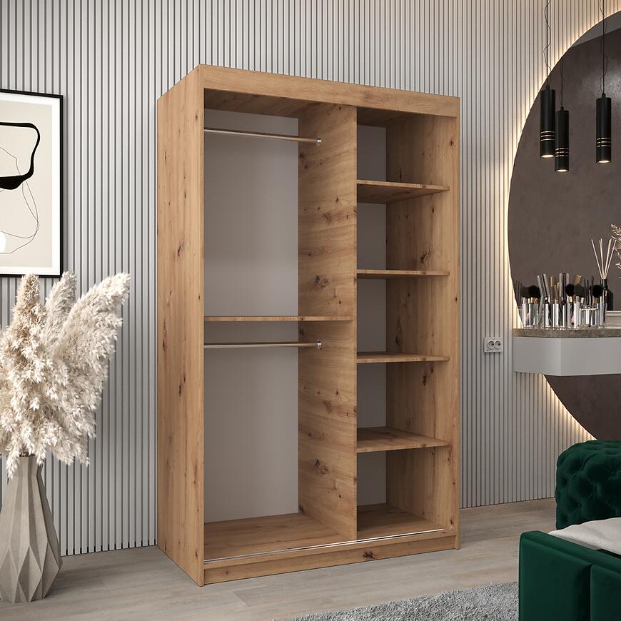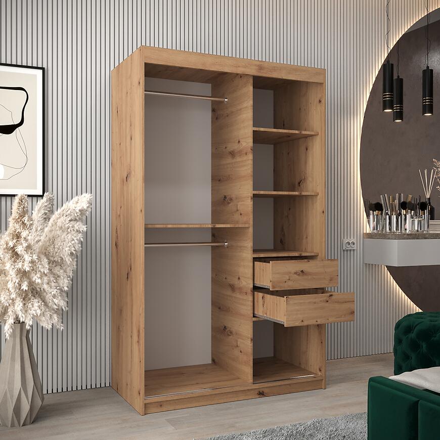 Szafa wyposażona jest w dwudrzwiowy system przesuwny, który pozwala wygodnie korzystać z wnętrza bez zajmowania dodatkowej przestrzeni przed meblem. To rozwiązanie sprawia, że szafa świetnie sprawdzi się zarówno w większych, jak i mniejszych pomieszczeniach, zachowując komfort użytkowania. Drzwi przesuwne działają płynnie, dzięki czemu codzienne otwieranie i zamykanie szafy jest łatwe i bezproblemowe.