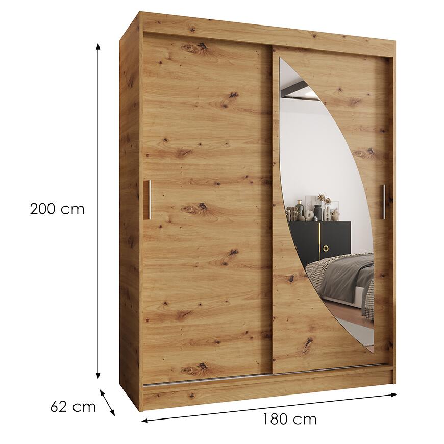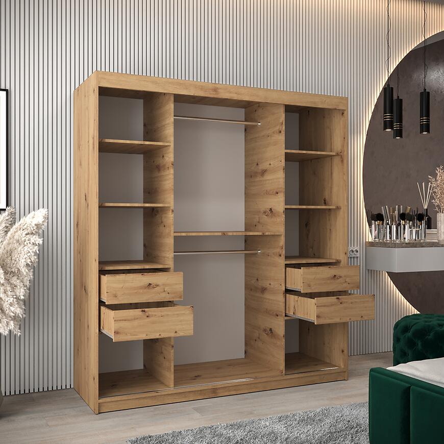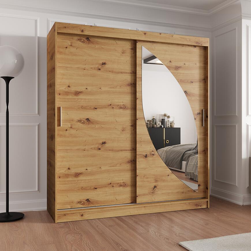 Szafa Milo 180 w kolorze artisan to połączenie przestronności, funkcjonalności i nowoczesnego designu. Jasny, drewnopodobny odcień frontów i korpusu wprowadza do wnętrza ciepło i naturalny charakter, a matowe wykończenie podkreśla elegancję i jednocześnie ułatwia utrzymanie czystości, eliminując widoczność odcisków palców czy drobnych zabrudzeń.