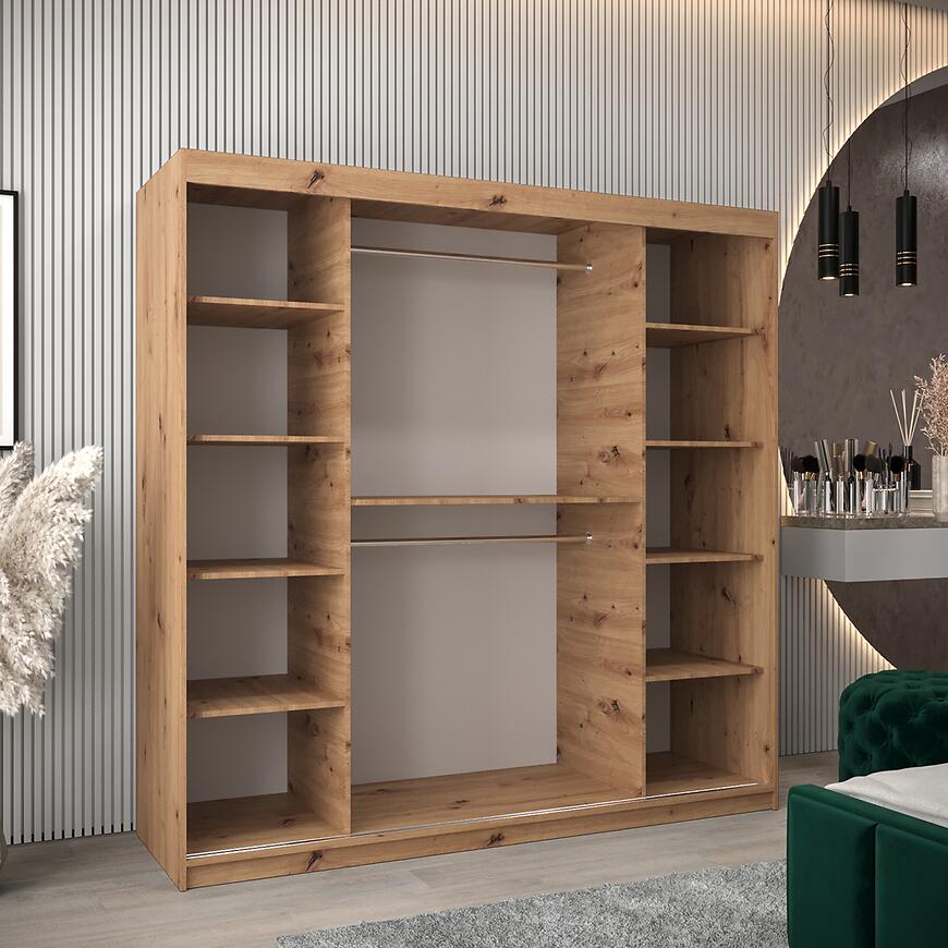 Szafa Milo 200 artisan to uniwersalna szafa przesuwna z lustrem, która sprawdzi się jako główny mebel do przechowywania odzieży. Jasne drewnopodobne wybarwienie, matowe powierzchnie oraz nowoczesny styl kolekcji MILO czynią ją atrakcyjnym wyborem do wielu aranżacji. To solidna szafa dwudrzwiowa, zaprojektowana z myślą o estetyce i wygodzie użytkowania.