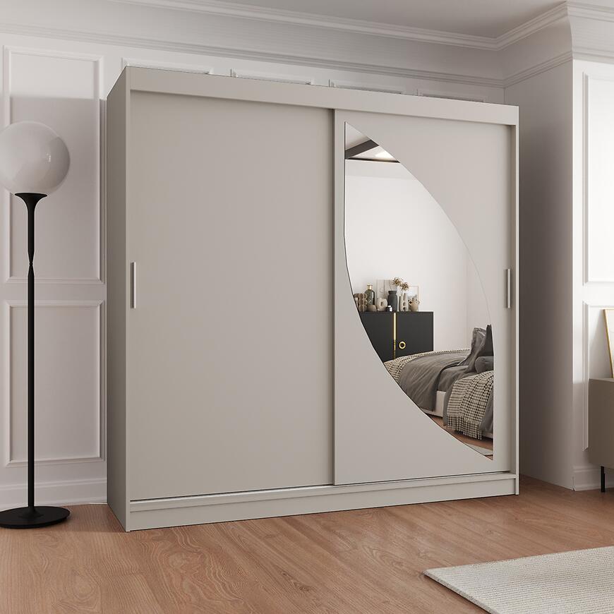 Dwudrzwiowa konstrukcja z drzwiami przesuwnymi umożliwia wygodne użytkowanie szafy nawet w mniejszych pomieszczeniach. System przesuwny pozwala na swobodny dostęp do wnętrza bez konieczności pozostawiania wolnej przestrzeni przed meblem. Jedno ze skrzydeł wyposażone w lustro pełni praktyczną rolę w codziennym użytkowaniu oraz optycznie powiększa pomieszczenie, rozjaśniając aranżację. Szafa Milo 200 kaszmir stanowi funkcjonalne rozwiązanie do przechowywania odzieży i dodatków.