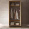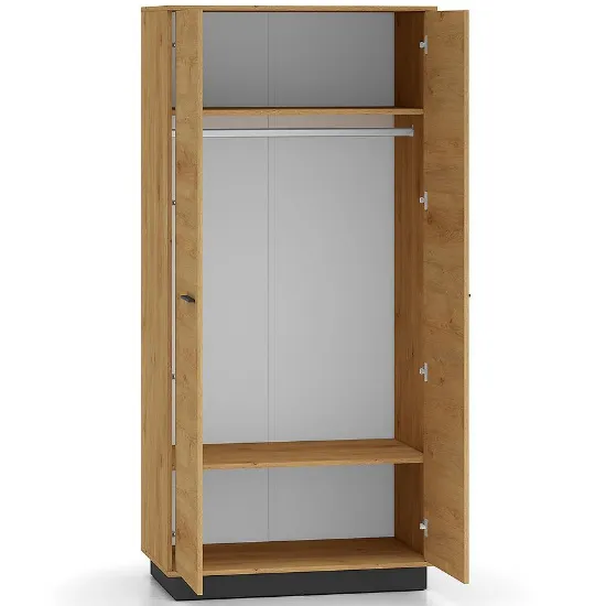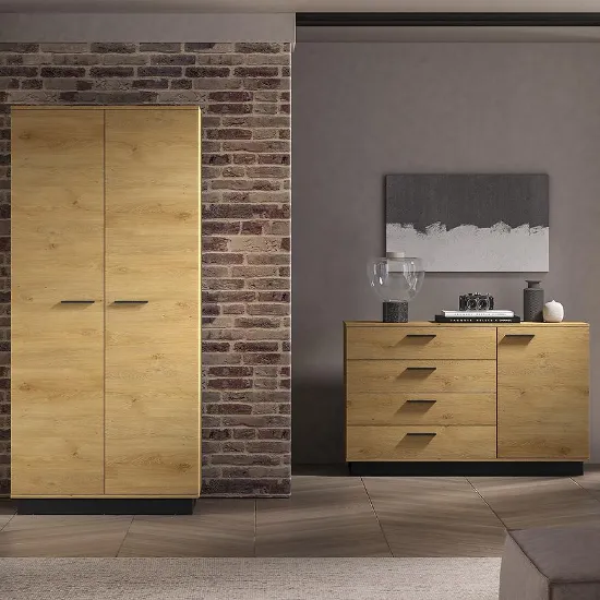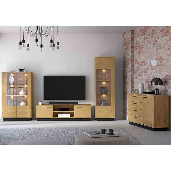W skład kolekcji Modesto wchodzą różnorodne elementy, które pozwalają na funkcjonalne zagospodarowanie przestrzeni. Komoda dwudrzwiowa z szufladami oraz komoda jednodrzwiowa z szufladami zapewniają mnóstwo miejsca do przechowywania, ułatwiając organizację przedmiotów codziennego użytku. Witryna jednodrzwiowa i witryna dwudrzwiowa z półkami pozwalają na efektowne wyeksponowanie dekoracji, książek lub szkła. Opcjonalne oświetlenie LED dostępne za dodatkową opłatą nadaje wnętrzu wyjątkowego klimatu. Półka to doskonałe miejsce na ulubione dodatki, a szafka RTV z szafkami i półkami zapewnia wygodne miejsce na sprzęt multimedialny. Całość dopełnia pojemna szafa z półką i drążkiem na ubrania, która zwiększa funkcjonalność kolekcji.
