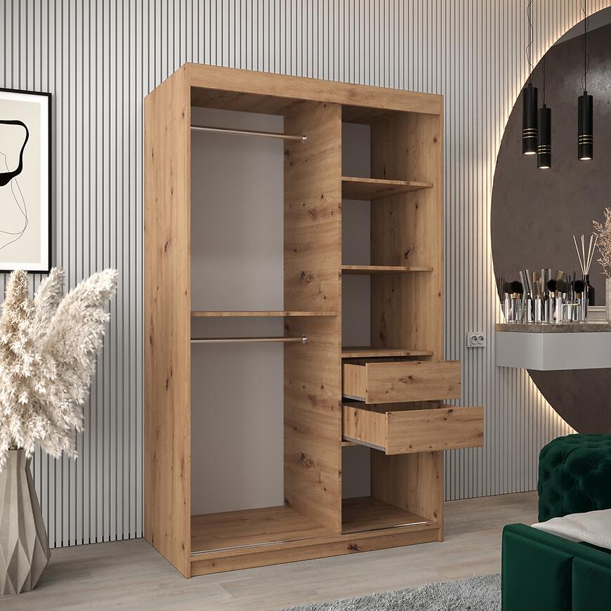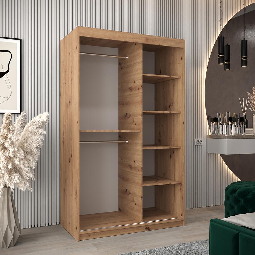 Szafa Moka 120 artisan to nowoczesna szafa przesuwna z lustrem, która łączy kompaktowe wymiary z funkcjonalnym wnętrzem. Jasne drewnopodobne fronty i matowe wykończenie sprawiają, że mebel doskonale komponuje się w sypialniach, przedpokojach i garderobach. To dwudrzwiowa szafa z kolekcji MOKA, idealna dla osób szukających praktycznego i estetycznego rozwiązania w nowoczesnym stylu.