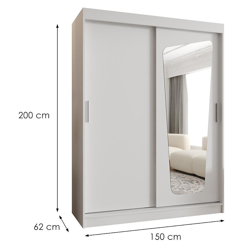 Drzwi przesuwne pozwalają na wygodne użytkowanie szafy nawet w pomieszczeniach, gdzie nie ma miejsca na tradycyjne otwieranie skrzydeł. Dwudrzwiowa konstrukcja umożliwia szybki dostęp do wnętrza, a zastosowane lustro na jednym z frontów zwiększa funkcjonalność mebla. Szafa z lustrem 150 cm ułatwia codzienne przygotowania i optycznie powiększa pomieszczenie, co ma szczególne znaczenie w jasnych aranżacjach.
