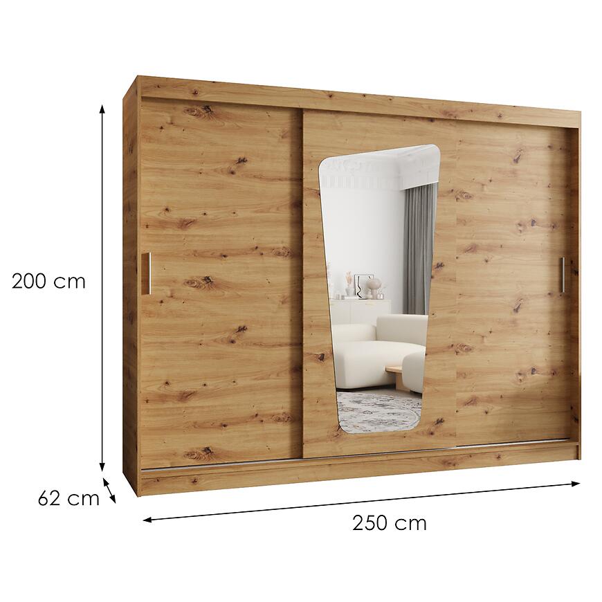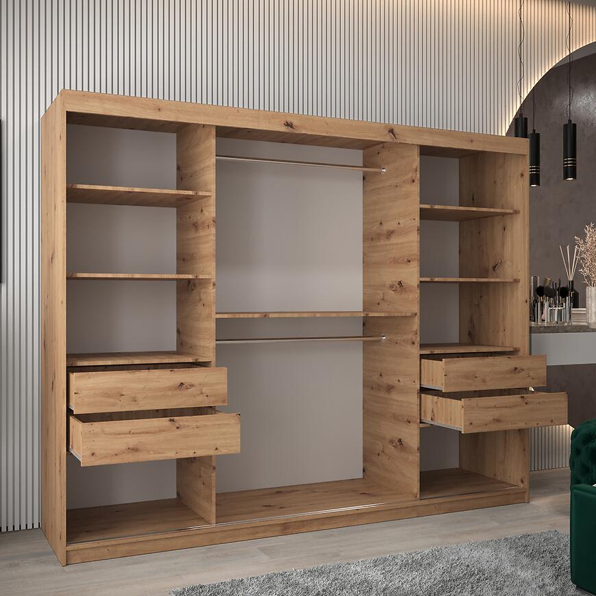 Szafa Moka 250 artisan to elegancki i funkcjonalny mebel, który sprawdzi się w przestronnych sypialniach, garderobach i przedpokojach. Model z kolekcji MOKA o szerokości 250 cm zapewnia dużą powierzchnię do przechowywania odzieży, dodatków i tekstyliów domowych, pomagając utrzymać porządek w codziennym użytkowaniu. Jasne drewnopodobne wybarwienie frontów i korpusu w matowym wykończeniu wprowadza do wnętrza przytulny i naturalny klimat, idealny do nowoczesnych aranżacji.