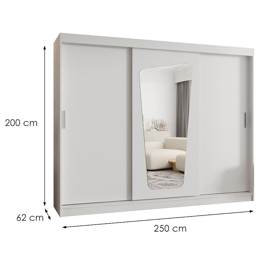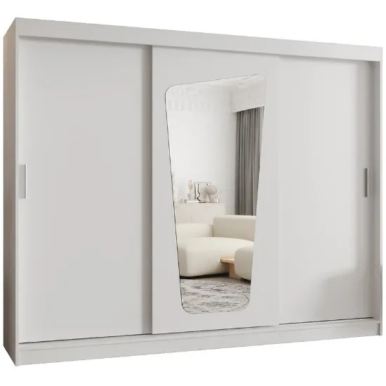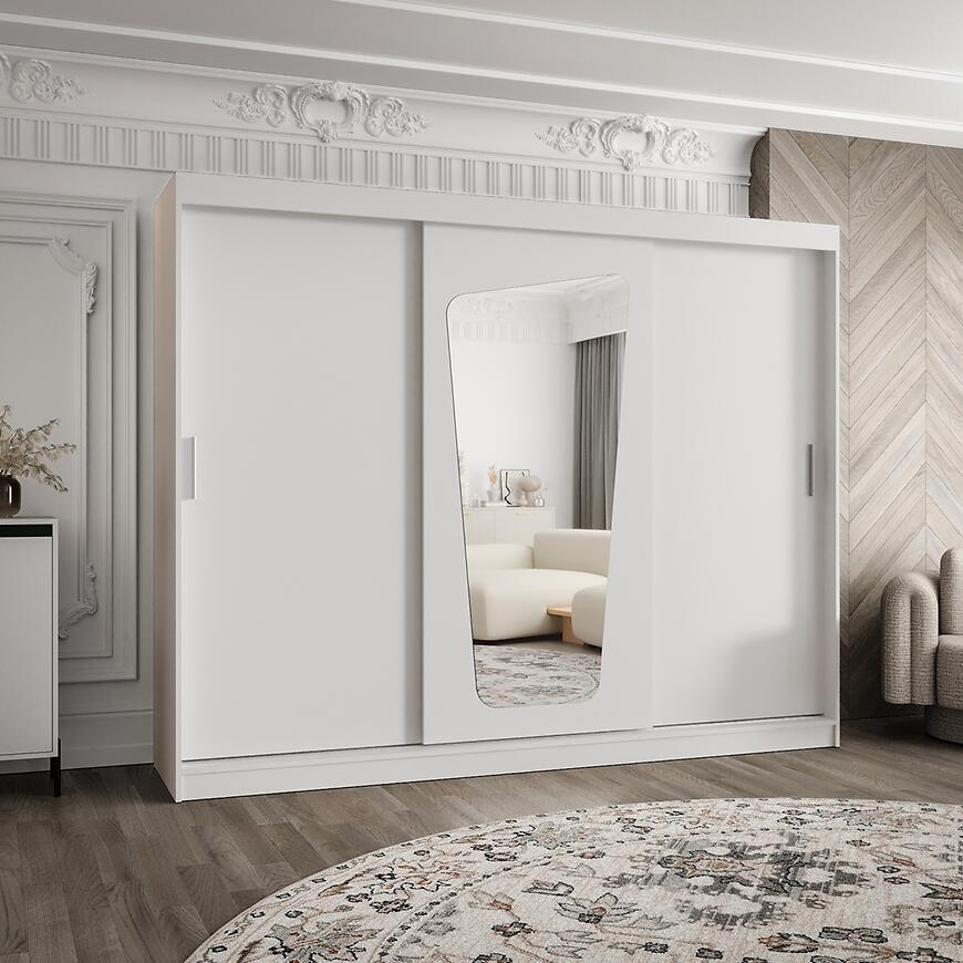Szafa Moka 250 biały to idealny wybór dla osób szukających przestronnej, trzydrzwiowej szafy przesuwnej z lustrem. Doskonale sprawdzi się w sypialni lub garderobie, wprowadzając do wnętrza porządek, jasność i nowoczesny styl.