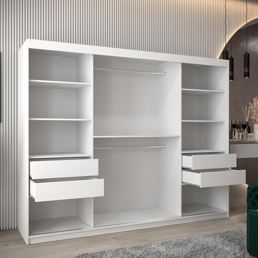 Szafa Moka 250 biały to elegancki i praktyczny mebel, który doskonale sprawdzi się w nowoczesnych sypialniach, garderobach oraz przestronnych przedpokojach. Szerokość 250 cm zapewnia dużą powierzchnię do przechowywania ubrań, dodatków i tekstyliów, pomagając utrzymać porządek w codziennym użytkowaniu. Biały kolor frontów i korpusu w matowym wykończeniu wprowadza do wnętrza jasność, świeżość i minimalistyczny styl.