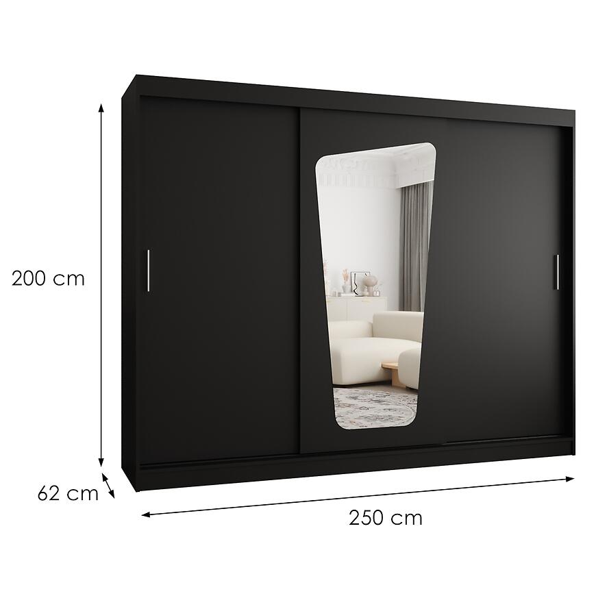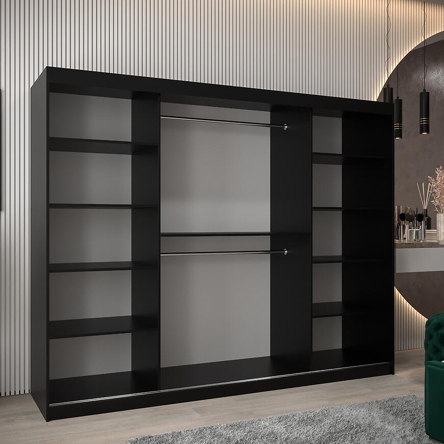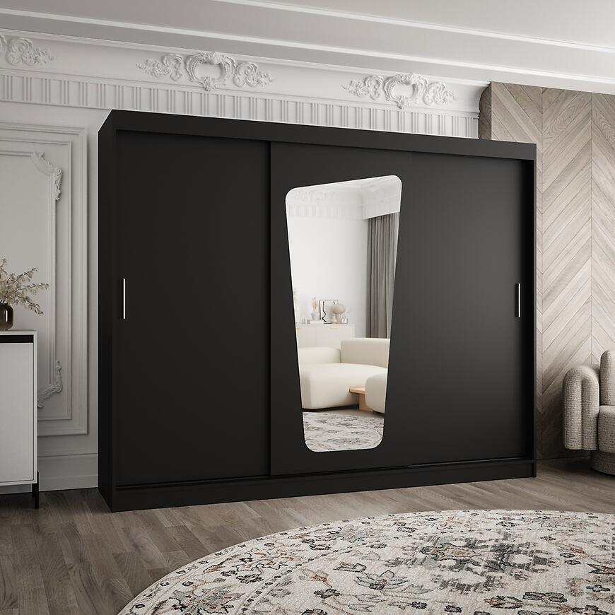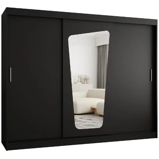 Szafa Moka 250 czarny to doskonały wybór dla osób szukających przestronnej, trzydrzwiowej szafy przesuwnej z lustrem. Idealnie sprawdzi się w sypialni lub garderobie, wprowadzając do wnętrza porządek, elegancję i nowoczesny styl.