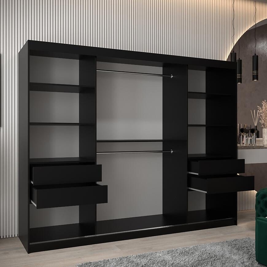 Szafa Moka 250 czarny łączy elegancję z funkcjonalnością, doskonale wpisując się w nowoczesne aranżacje sypialni, garderób czy przedpokojów. Szerokość 250 cm zapewnia przestronną powierzchnię do przechowywania ubrań, dodatków i tekstyliów, ułatwiając utrzymanie porządku w codziennym użytkowaniu. Ciemny, matowy kolor frontów i korpusu nadaje wnętrzu wyrafinowany i minimalistyczny charakter.