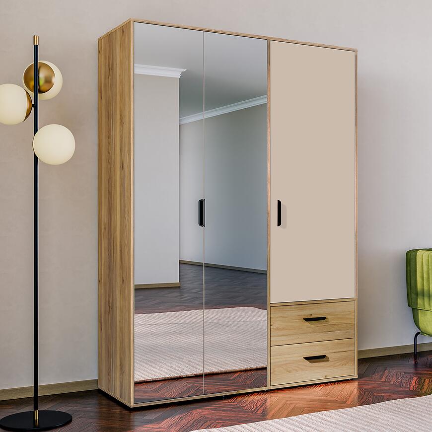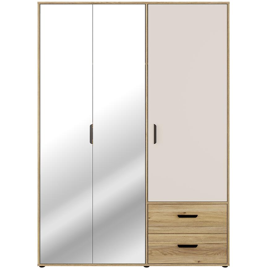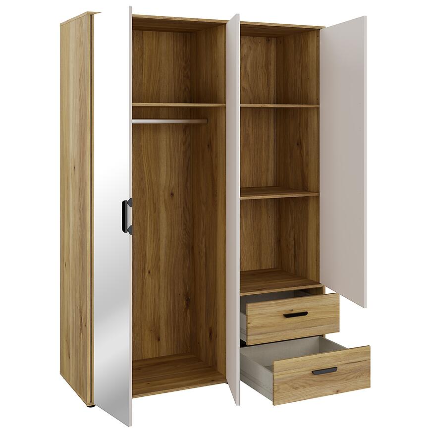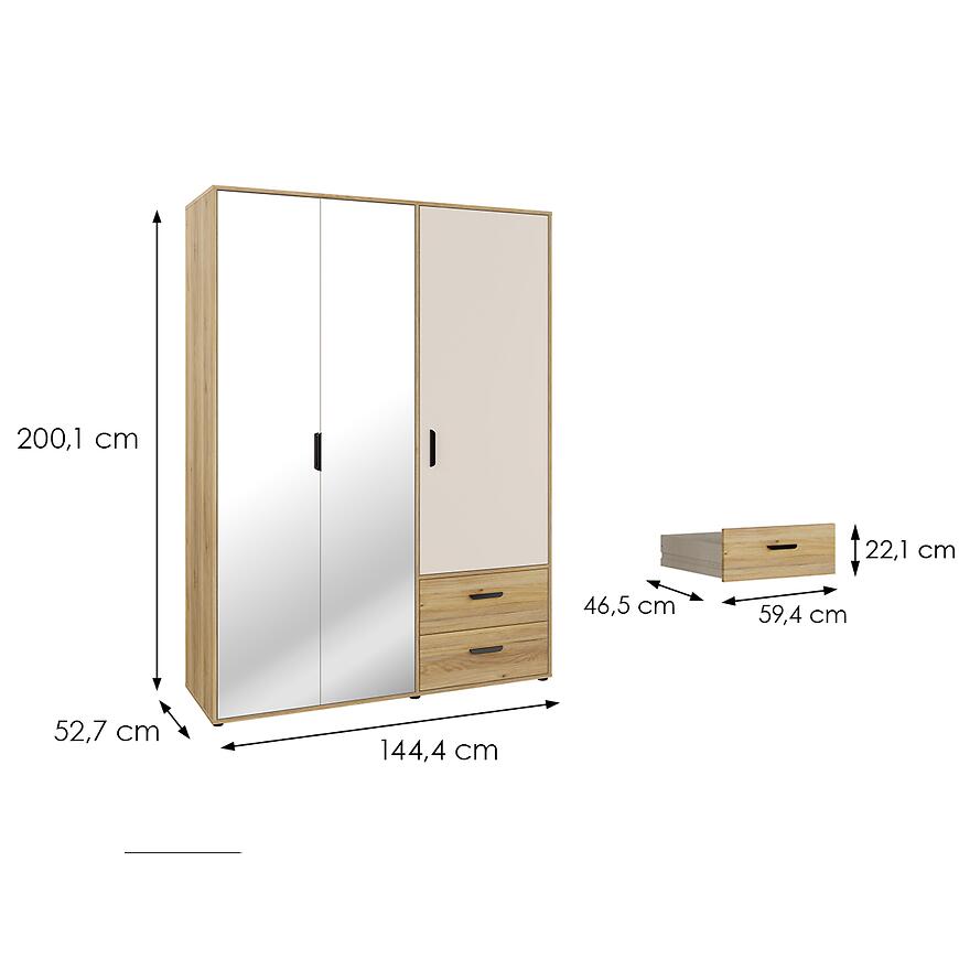 Szafa posiada trzy drzwi i dwie szuflady, które umożliwiają wygodne przechowywanie odzieży, bielizny i drobnych akcesoriów, zapewniając porządek i łatwy dostęp do wszystkich przedmiotów. Jedno z drzwi zostało wyposażone w lustro, co zwiększa funkcjonalność mebla, pozwala na optyczne powiększenie przestrzeni i ułatwia codzienne przygotowania, jednocześnie nadając wnętrzu nowoczesnego charakteru.