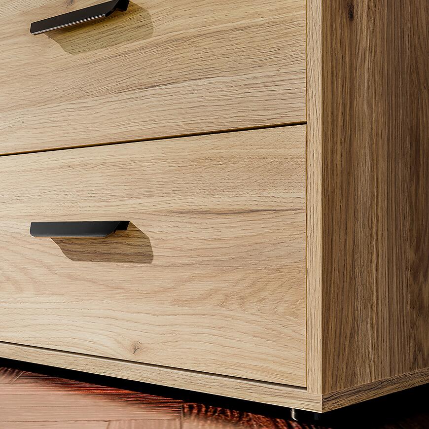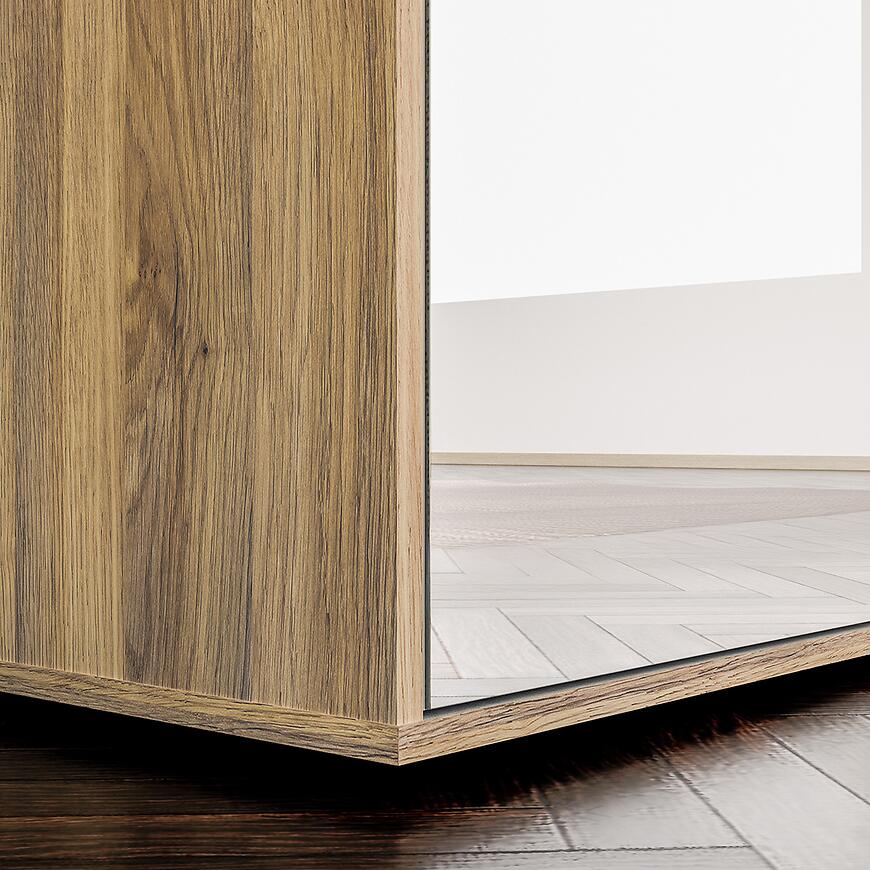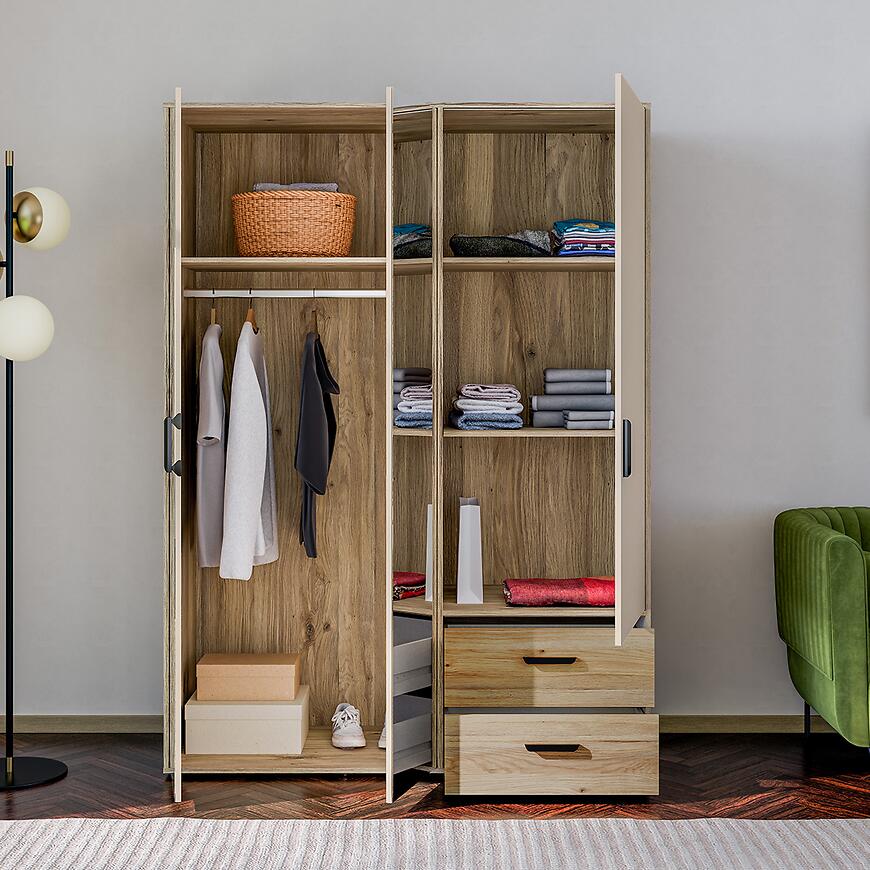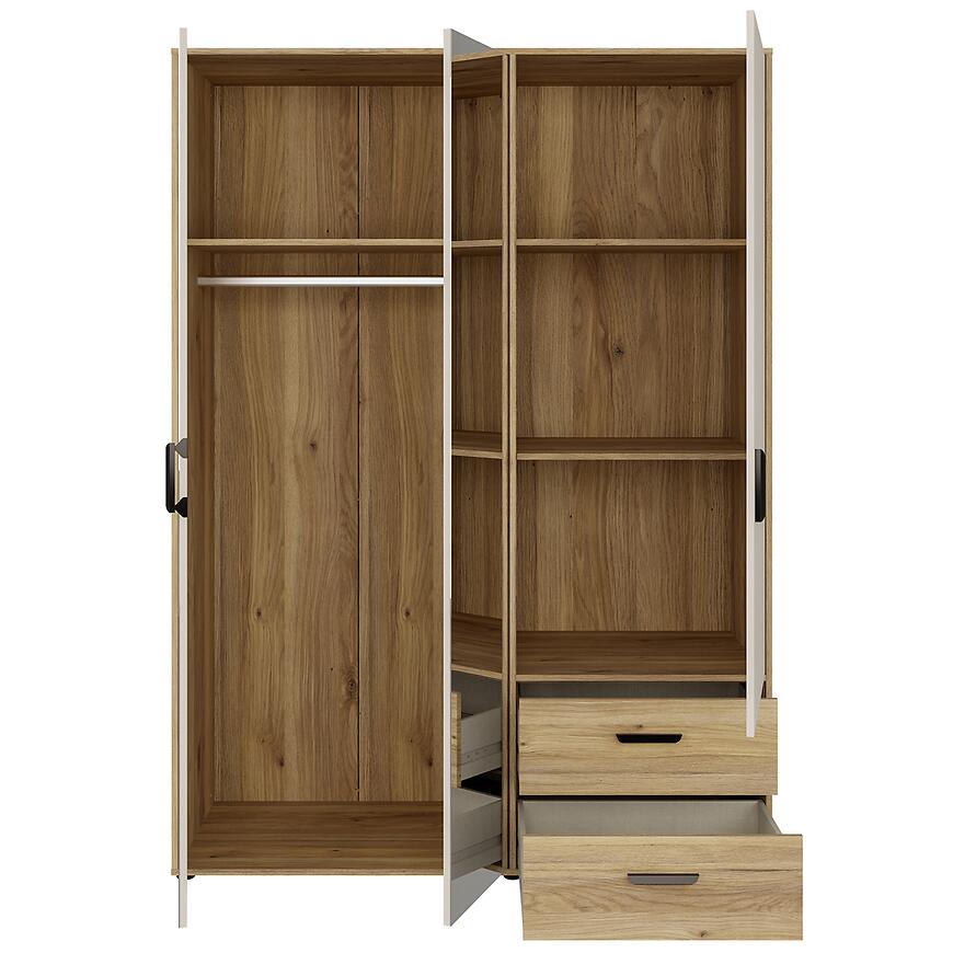 Szafa posiada trzy drzwi i dwie szuflady, które umożliwiają wygodne przechowywanie odzieży, bielizny i drobnych akcesoriów, zapewniając porządek i łatwy dostęp do wszystkich przedmiotów. Jedno z drzwi zostało wyposażone w lustro, co zwiększa funkcjonalność mebla, pozwala na optyczne powiększenie przestrzeni i ułatwia codzienne przygotowania, jednocześnie nadając wnętrzu nowoczesnego charakteru.