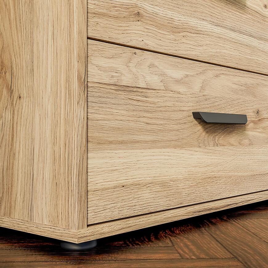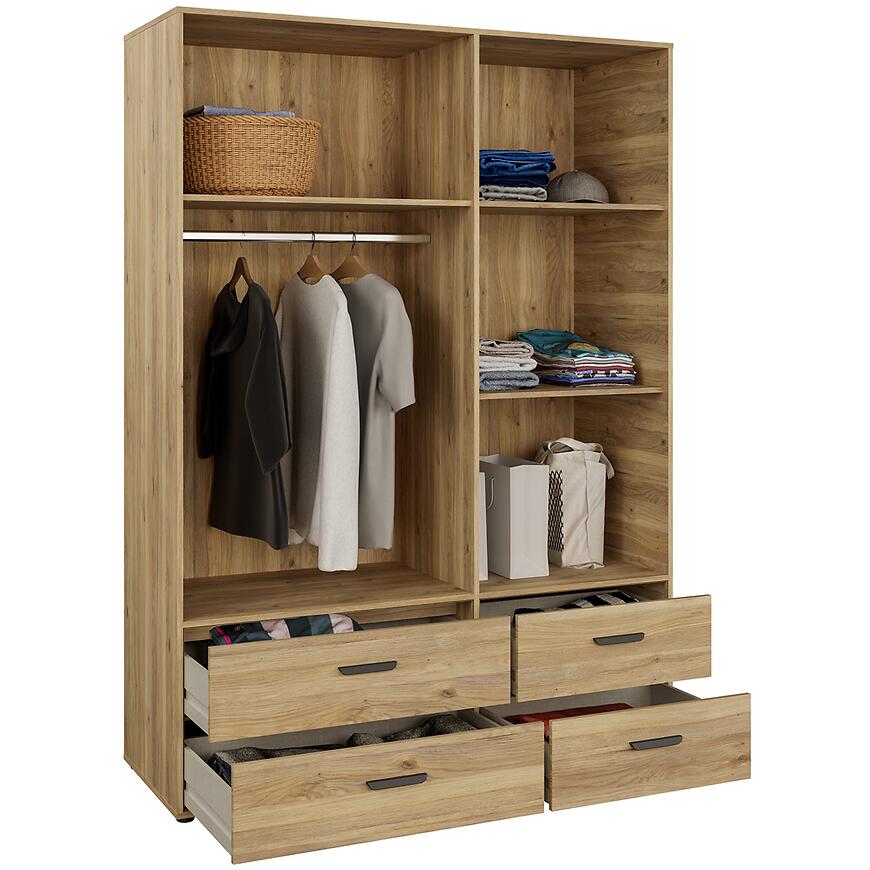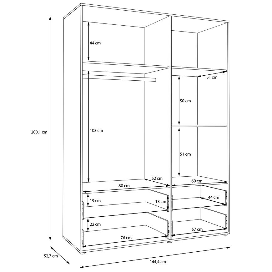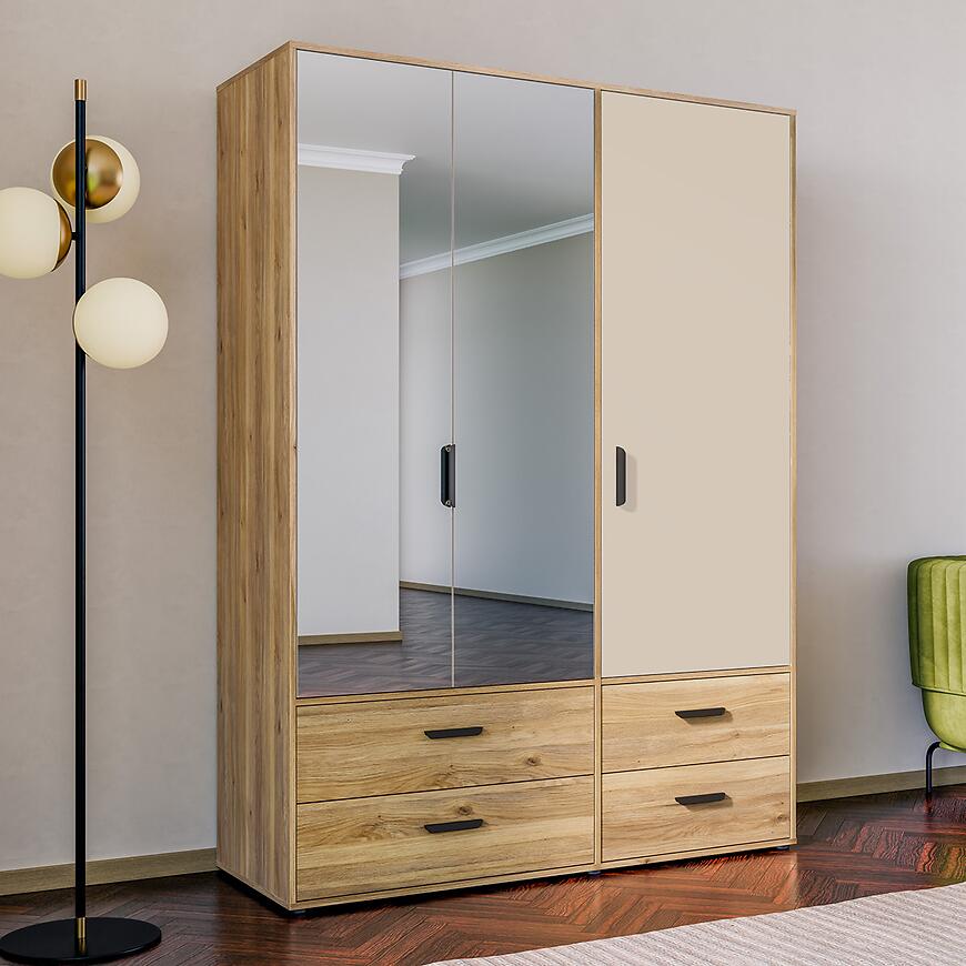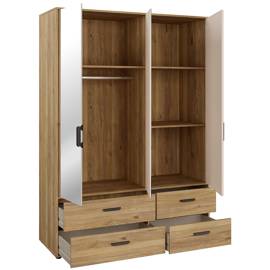 Szafa posiada trzy drzwi i cztery szuflady, które umożliwiają wygodne segregowanie odzieży, bielizny i drobnych akcesoriów, zapewniając porządek i komfort użytkowania. Jedno z drzwi wyposażone jest w lustro, co dodatkowo zwiększa funkcjonalność mebla, pozwala optycznie powiększyć przestrzeń i ułatwia codzienne przygotowania. Konstrukcja frontów i korpusu została starannie zaprojektowana tak, aby łączyć estetykę z trwałością, umożliwiając wygodne użytkowanie przez wiele lat.