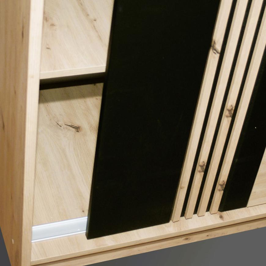 Szafa jest dwudrzwiowa, z systemem drzwi przesuwnych, który ułatwia codzienne użytkowanie, szczególnie w mniejszych pomieszczeniach. Przesuwne drzwi pozwalają zaoszczędzić przestrzeń, zapewniając jednocześnie łatwy dostęp do wnętrza szafy. Fronty wykonane zostały z foliowanej płyty MDF, co gwarantuje trwałość oraz estetyczny wygląd przez lata. Korpus szafy zbudowany jest z laminowanej płyty wiórowej, charakteryzującej się odpornością na zarysowania oraz łatwością w utrzymaniu czystości.