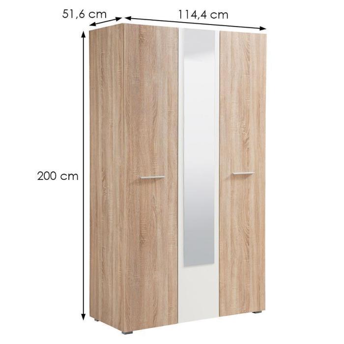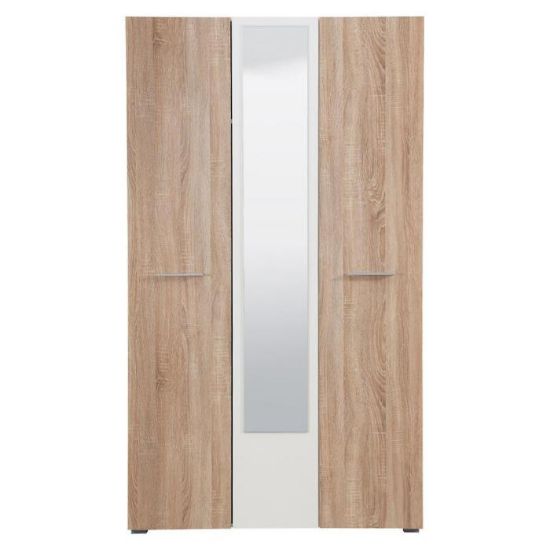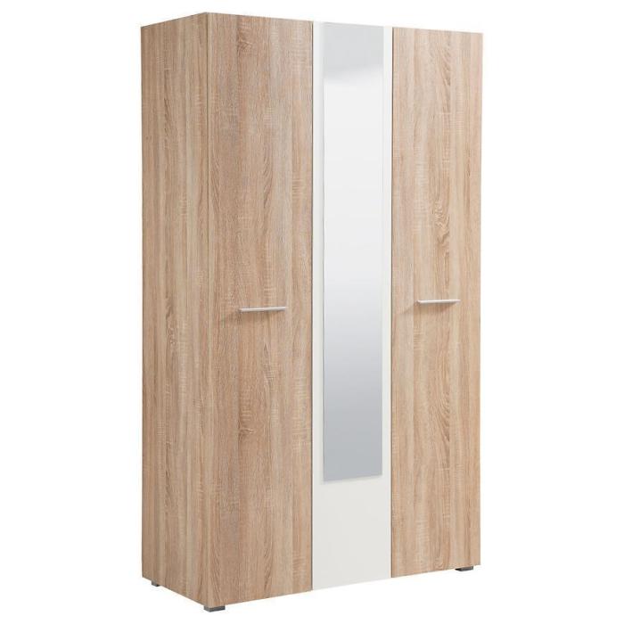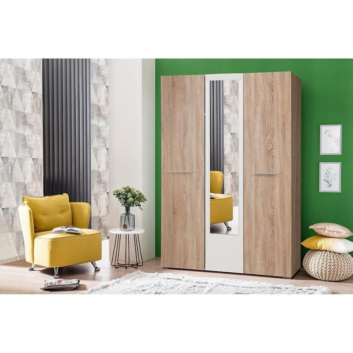 Szafa trzydrzwiowa RITMO to doskonała propozycja do sypialni, a także do przedpokoju. Może stanowić doskonałe uzupełnienie garderoby. Korpus oraz fronty szafy wykonane są w kolorze sonoma. Korpus w matowym wykończeniu. Szafa posiada drzwi klasyczne z lustrem. Wygląd szafy jest ponadczasowy i będzie pasować do większości aranżacji.
