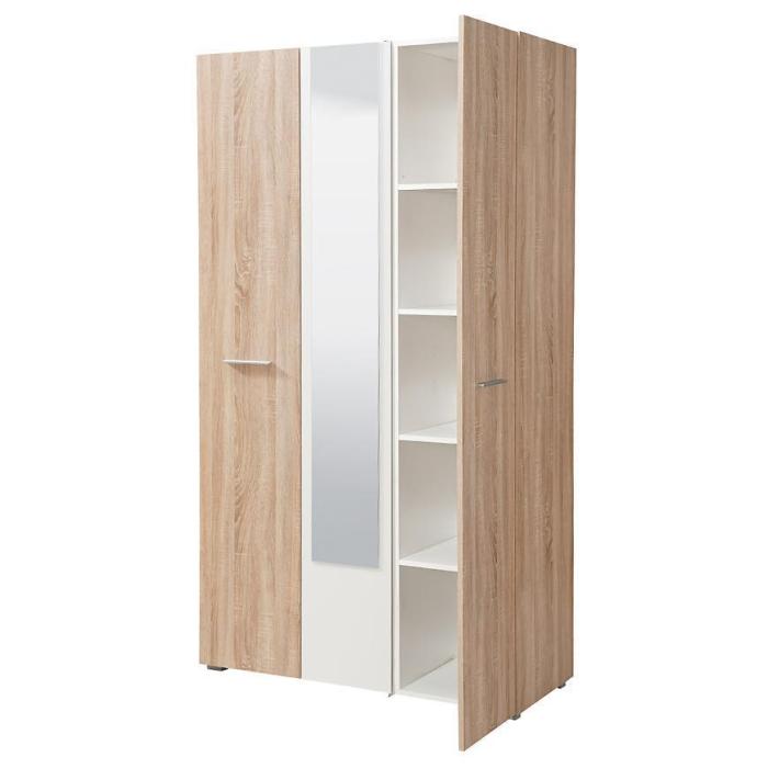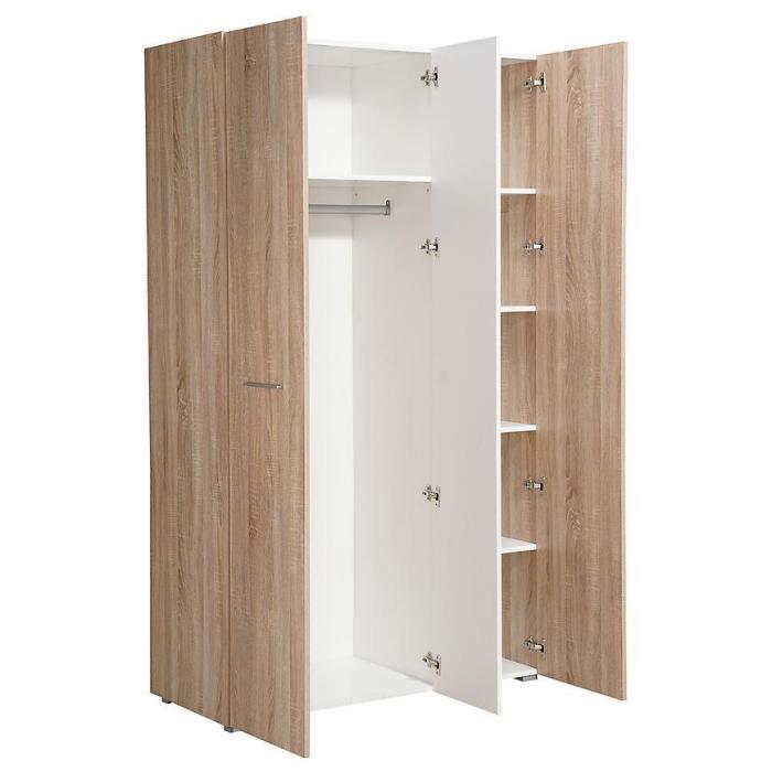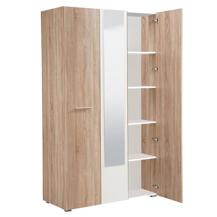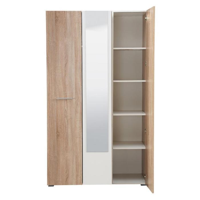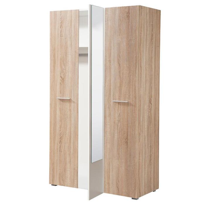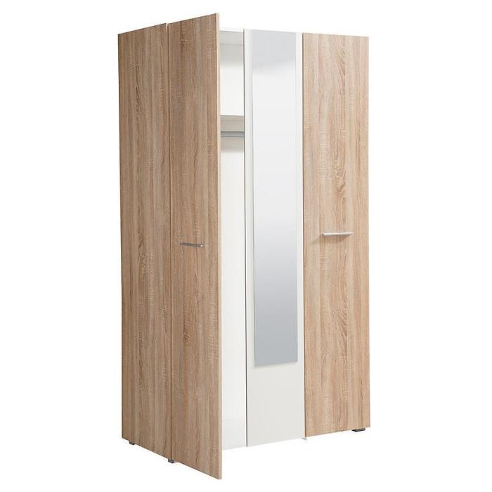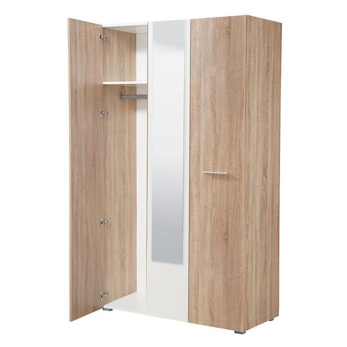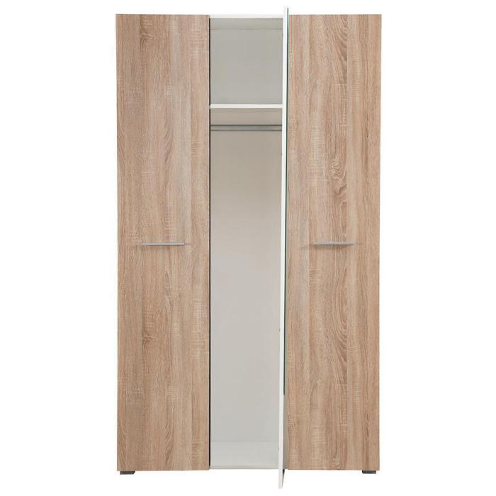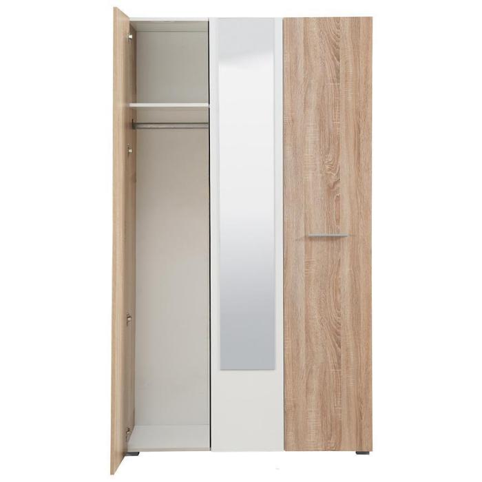 Jej wnętrze podzielone jest na dwie części, w której znajduje się miejsce na drążek na długie ubrania oraz półki do przechowywania ubrań i rzeczy. Pojemna szafa jest wykonana z odpornej płyty laminowanej.