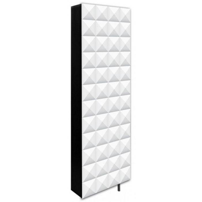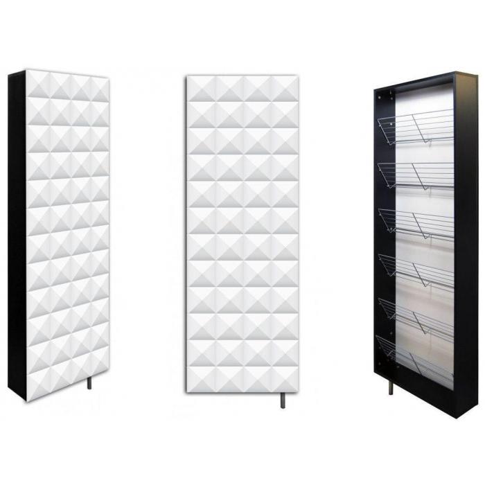 Biel w przedpokoju nigdy nie wychodzi z mody – jest uniwersalna, ponadczasowa, doskonale pasuje do rozmaitych aranżacji. W trend ten wpisuje się szafa na buty Białe Kwadraty, która zachwyca trójwymiarowym wzorem nadruku. Najważniejsza jest jednak jej funkcjonalność – jest to obrotowa szafa na buty do przedpokoju, ze stalowym systemem obrotowym, mocowana do ściany, podparta na smukłej nóżce. Wyposażono ją w sześć półek, na których zmieści się aż osiemnaście par butów. W zależności od dostępnej przestrzeni, szafa na buty Białe Kwadraty może otwierać się na prawą lub na lewą stronę. Wykonano ją z bardzo solidnej płyty meblowej o grubości 18 mm, więc przez długie lata służyć będzie w niezmiennie idealnym stanie!