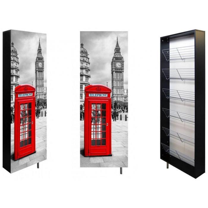Szafa na buty Budka Telefoniczna pozwoli Ci zapomnieć o kłopotach z przechowywaniem obuwia! Aż sześć wykonanych ze stali półek zapewnia wyjątkową pojemność – zmieści się na nich nawet kilkanaście par obuwia. Obrotowa szafa na buty Budka Telefoniczna mocowana jest bezpośrednio do ściany, stabilności całej konstrukcji dodaje smukła stalowa nóżka. Wykonano ją z płyty meblowej w kolorze czarnym o grubości 18 mm, z obrzeżem typu ABS o grubości 1 mm. Obrotowa szafa na buty do przedpokoju ma także ciekawe zdobienie – jej front stanowi nadruk przedstawiający czerwoną budkę telefoniczną na tle fantastycznej panoramy Londynu. To stylowy mebel, który doskonale podkreśli aranżację nowoczesnego przedpokoju!