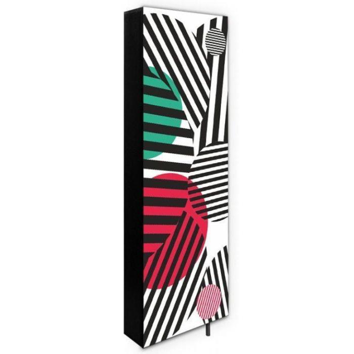 Szafa na buty do przedpokoju nie musi być nudna! Najlepszym przykładem jest szafa na buty Kółka i Paski, której front zdobiony jest fantazyjnym nadrukiem przedstawiającym te właśnie figury. Dzięki temu, szafa na buty jest świetnym uzupełnieniem m.in. dla nowoczesnej aranżacji. Jeśli chodzi o walory funkcjonalne, szafa na buty Kółka i Paski została wykonana z bardzo wytrzymałej płyty meblowej o grubości 18 mm (z obrzeżem ABS 1 mm). Montuje się ją bezpośrednio do ściany (może otwierać się na prawą lub na lewą stronę), całość stabilizuje smukła nóżka ze stali. Szafa posiada sześć stalowych półek, na których zmieści się kilkanaście par butów.