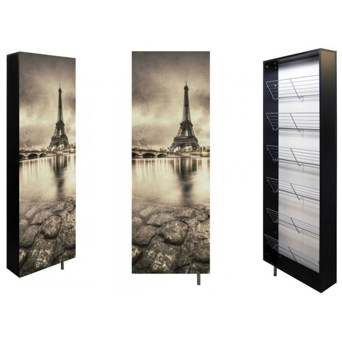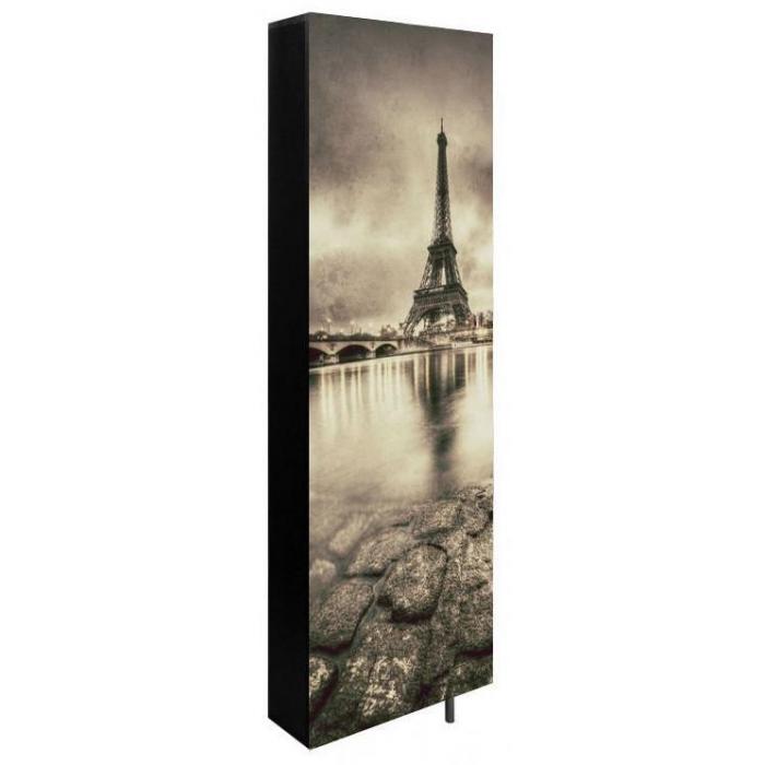 Paryż to miasto od lat będące inspiracją dla artystów – również dla projektantów mebli. Grafiką z przepięknym widokiem stolicy Francji wraz z charakterystyczną dlań wieżą Eiffla ozdobiona jest nowoczesna szafa na buty Paris. Nowoczesność przejawia się jednak nie tylko w dekoracyjnym nadruku. Jest to bowiem obrotowa szafa na buty – mocuje się ją bezpośrednio do ściany, w zależności od potrzeb może otwierać się na prawą lub na lewą stronę, stabilności dodaje konstrukcji smukła stalowa nóżka. Szafa na buty Paris posiada sześć wykonanych ze stali półek, na których bez problemu zmieści się kilkanaście par butów. Wykonana została z czarnej płyty meblowej o grubości 18 mm, wykończonej obrzeżem ABS.
