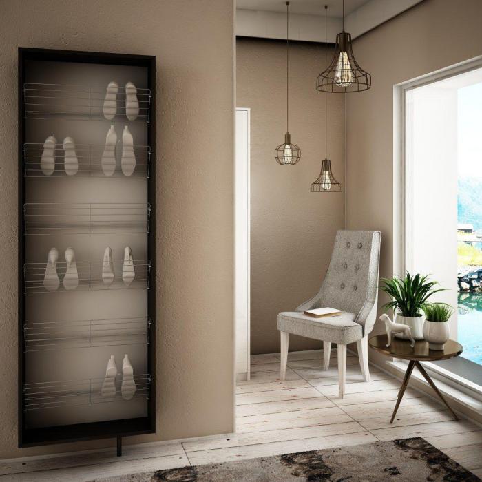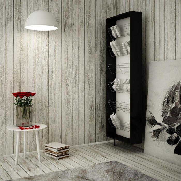 Wykonanie (materiały): płyta meblowa 18mm, obrzeże ABS 1mm, stalowe półki na buty, system obrotowy - stal nierdzewna