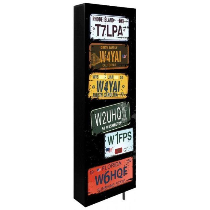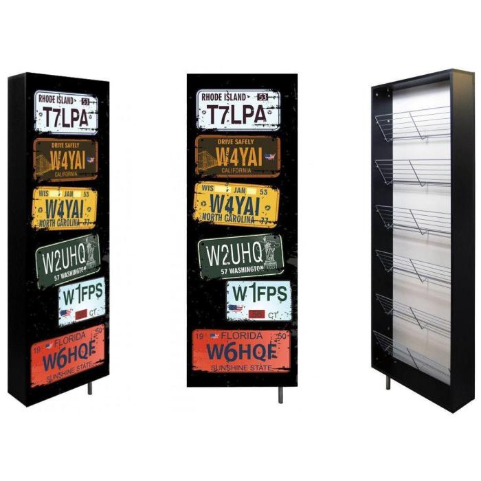 W każdym mieszkaniu potrzebna jest pojemna obrotowa szafa na buty – pozwoli ona przechowywać obuwie w jednym miejscu i utrzymywać w przedpokoju porządek. Jeśli zachwyca przy tym nowoczesnym designem, mamy do czynienia z meblem idealnym! Taka właśnie jest szafa na buty Tablice, która nie dość, że posiada aż sześć pojemnych, wykonanych ze stali półek, to jeszcze jest dekorowana wyjątkowym nadrukiem, przedstawiającym tablice rejestracyjne samochodów z różnych stanów USA. Szafa na buty Tablice montowana jest bezpośrednio do ściany, podpiera się na wysokiej stalowej nóżce. Dzięki bardzo solidnym materiałom, z których została wykonana (płyta meblowa 18 mm, obrzeże ABS 1 mm) jest odporna na uszkodzenia i upływ czasu.