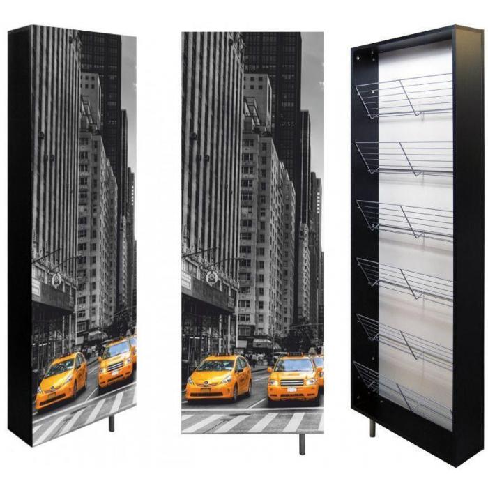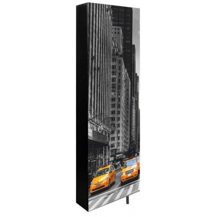 Szafa na buty Taxi doskonale uzupełni aranżację przedpokoju nowoczesnego czy industrialnego. Wszystko dlatego, że jej front udekorowany jest nadrukiem przedstawiającym charakterystyczne dla Nowego Jorku żółte taksówki na tle wielkomiejskiej ulicy. Jest to obrotowa szafa na buty – montuje się ją bezpośrednio do ściany, podparta jest na wysokiej stalowej nóżce, w zależności od potrzeb może otwierać się na prawą lub lewą stronę. Szafa na buty Taxi wyposażona jest w sześć stalowych półek, na których zmieści się kilkanaście par butów. Wykonano ją z płyt meblowych o grubości 18 mm z obrzeżem ABS 1 mm – jest meblem solidnym, wytrzymałym, w doskonałym stanie służy przez długie lata!