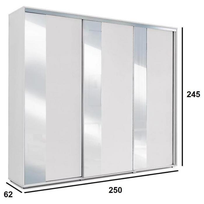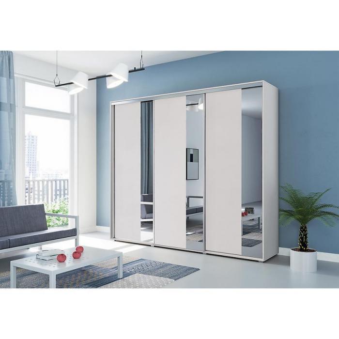 Szafa przesuwna Nadia z lustrem to praktyczny mebel do sypialni czy przedpokoju, może posłużyć również jako garderoba. Kolor mebla wpasuje się w wiele aranżacji. Mebel w kolorze białym będzie pasował do wnętrz klasycznych jak również do wnętrz nowoczesnych. To duża szafa, która posiada półki oraz drążki do wieszania ubrań, na których powiesisz nawet długie ubrania. Pojemna szafa to dobre rozwiązanie, żeby schować to czego potrzebujesz. Szafa z lustrem sprawdzi się z pewnością w danym pomieszczeniu. Kontenerek z szufladami do szafy jest dostępny za dopłatą.
