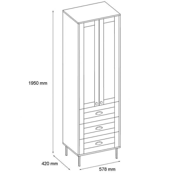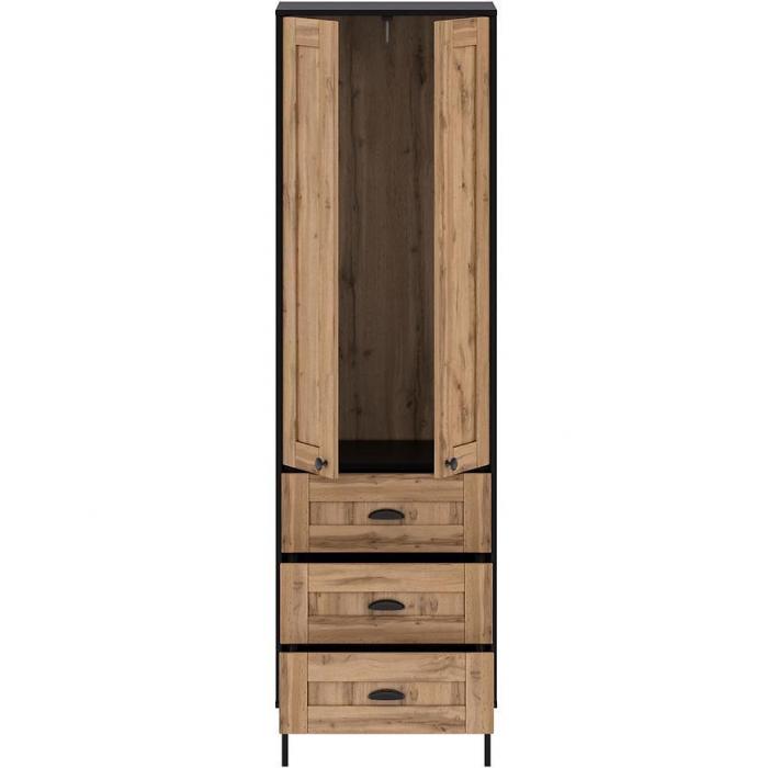 Szafa w kolorze dąb wotan/czarny z kolekcji Henry to doskonała propozycja do pokoju dziennego, ale znajdzie swoje miejsce również w innym pomieszczeniu, jak na przykład - przedpokój czy garderobie, sypialni. Materiał wykonania to płyta laminowana. Szafa posiada drążek na ubrania oraz szuflady. Mebel będzie świetnym miejscem do wieszania ubrań, na buty lub inne domowe tekstylia. Nowoczesny styl mebli wpadnie do gustu każdemu, kto poszukuje eleganckiego, klasycznego, a zarazem nowoczesnego umeblowania. Idealnie wpasuje się w aranżacje loftowe. Szafa przeznaczona do samodzielnego montażu.