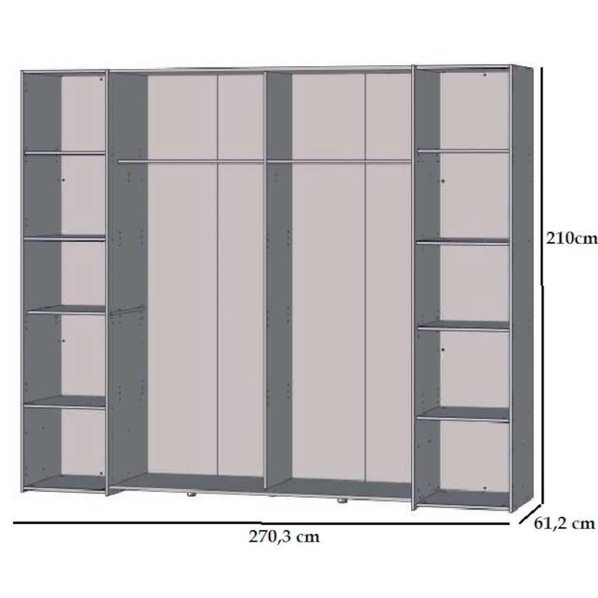 Szafa o szerokości 270 cm została wykonana z płyty wiórowej laminowanej. Wnętrze szafy zostało podzielone na trzy segmenty: dwa po prawej i lewej stronie o szerokości 49 cm oraz część środkową o szerokości 2 x 83 cm. Części boczne wyposażone są w drzwi uchylne, a część środkowa w drzwi przesuwne, co pozwala na wygodny dostęp do przechowywanych przedmiotów. Wnętrze szafy jest wyjątkowo funkcjonalne, z dziesięcioma półkami i dwoma drążkami na ubrania. Istnieje także możliwość dokupienia dodatkowych elementów, takich jak listwa okalająca, hamulec do drzwi, półki oraz kontenerek wewnętrzny, co pozwoli jeszcze lepiej dostosować szafę do własnych potrzeb.