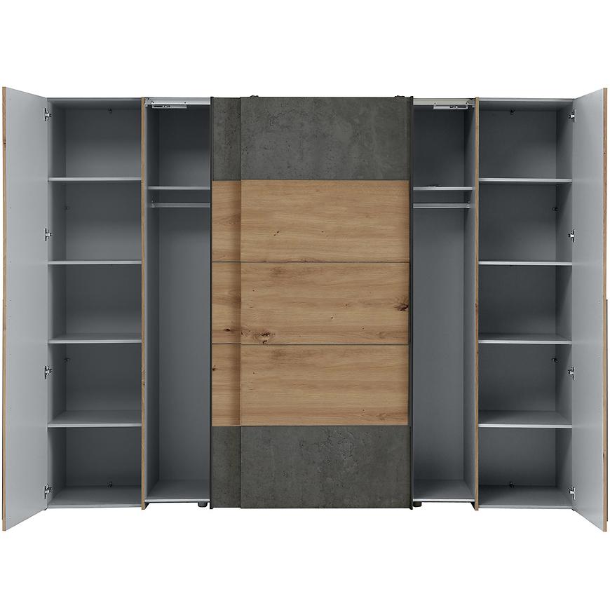Szafa o szerokości 270 cm została wykonana z płyty wiórowej laminowanej. Wnętrze szafy zostało podzielone na trzy segmenty: dwa po prawej i lewej stronie o szerokości 49 cm oraz część środkową o szerokości 2 x 83 cm. Części boczne wyposażone są w drzwi uchylne, a część środkowa w drzwi przesuwne, co pozwala na wygodny dostęp do przechowywanych przedmiotów. Wnętrze szafy jest wyjątkowo funkcjonalne, z dziesięcioma półkami i dwoma drążkami na ubrania. Istnieje także możliwość dokupienia dodatkowych elementów, takich jak listwa okalająca, hamulec do drzwi, półki oraz kontenerek wewnętrzny, co pozwoli jeszcze lepiej dostosować szafę do własnych potrzeb.