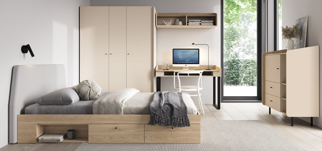 System Alessio beż piaskowy to kompleksowa kolekcja mebli młodzieżowych, stworzona z myślą o komfortowej i estetycznej aranżacji pokoju młodzieżowego. Jasny, delikatny odcień beżu wprowadza do wnętrza spokój i naturalne ciepło, sprzyjając koncentracji podczas nauki, relaksowi oraz kreatywnej aktywności. Kolekcja łączy nowoczesny design z praktycznymi rozwiązaniami, które pomagają utrzymać porządek w pokoju młodzieżowym.