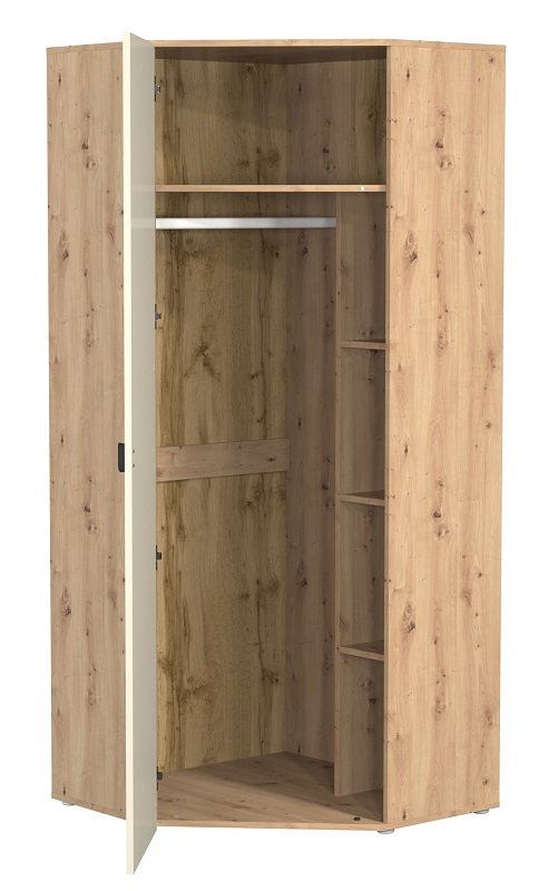 Szafa narożna Camaro Typ 7 jest jednodrzwiowa i wyposażona w uchylne drzwi, co umożliwia wygodny dostęp do wnętrza. Jej narożna konstrukcja pozwala na optymalne wykorzystanie przestrzeni w pokoju, co jest szczególnie ważne w mniejszych pomieszczeniach. W środku znajdują się cztery półki oraz drążek na ubrania, co zapewnia dużo miejsca na przechowywanie różnorodnych elementów garderoby. Dzięki dobrze przemyślanemu rozmieszczeniu półek i drążka, można łatwo utrzymać porządek i mieć wszystko na wyciągnięcie ręki.