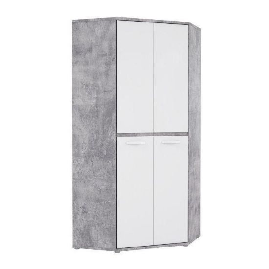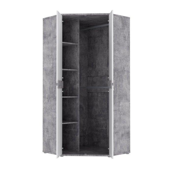 Canmore to szafa narożna z uchylnymi drzwiami, półkami oraz drążkiem do wieszania ubrań, na którym powiesisz nawet długie ubrania. Pojemna szafa to dobre rozwiązanie, żeby schować to czego potrzebujesz. Do szafy na ubrania można dokupić inne meble z kolekcji Canmore.