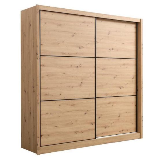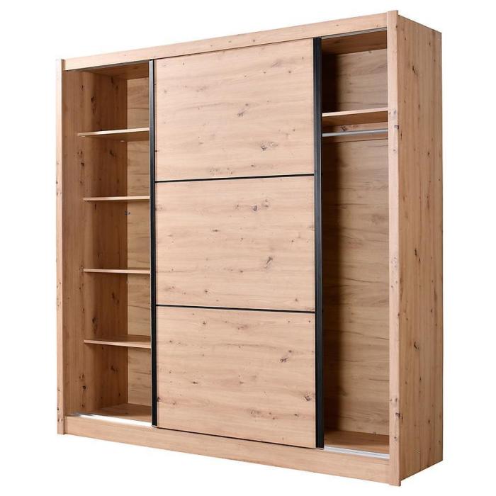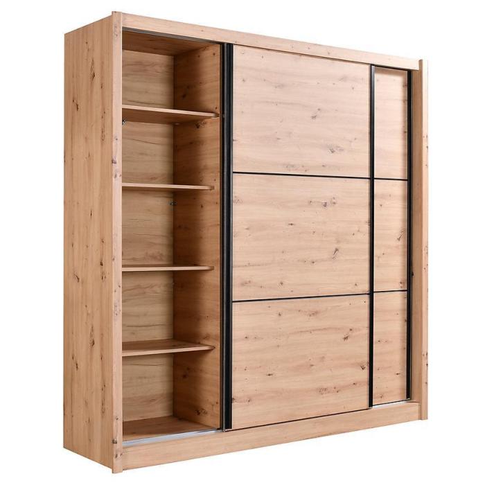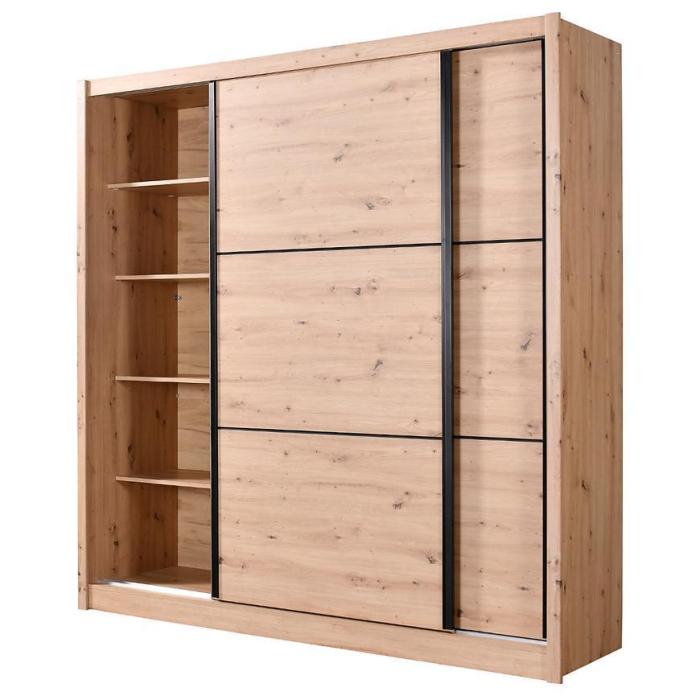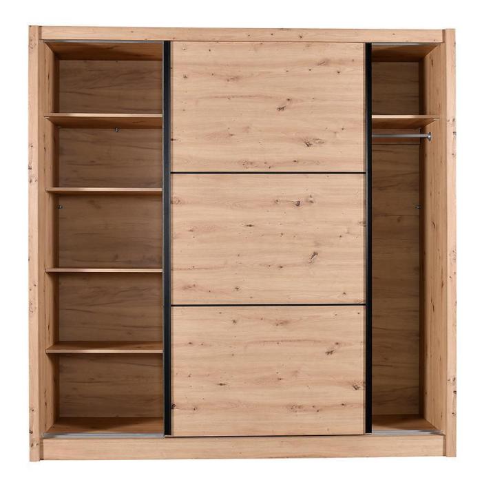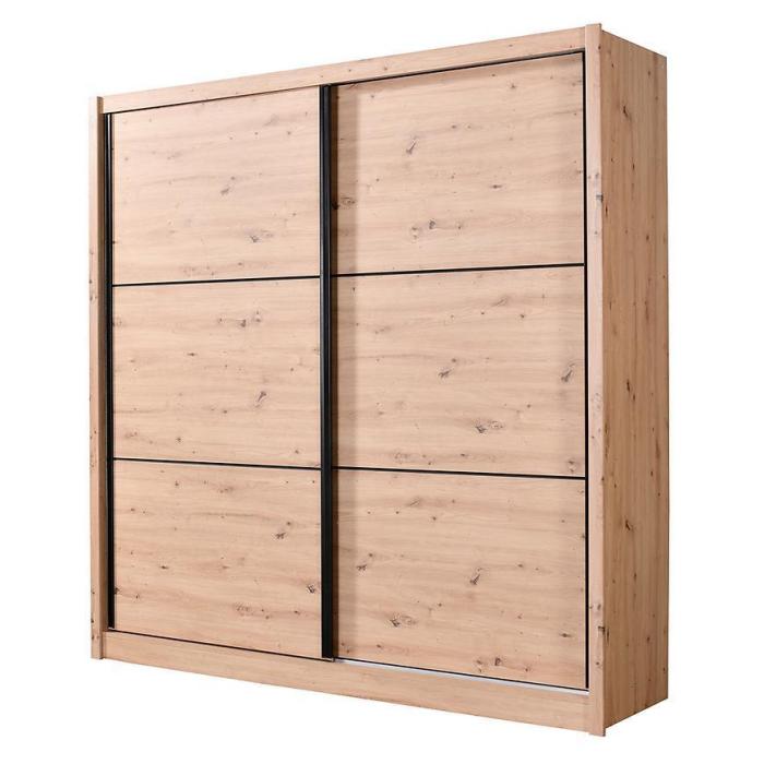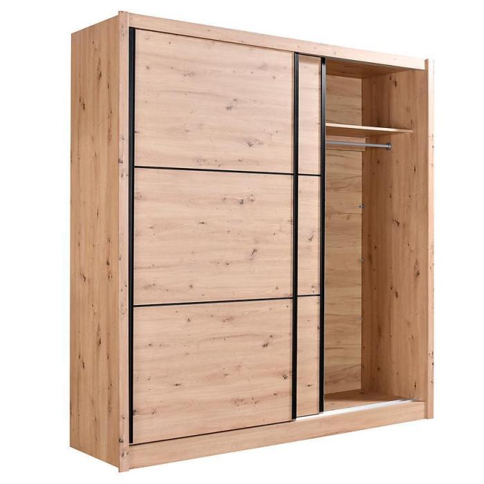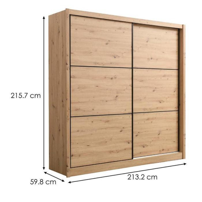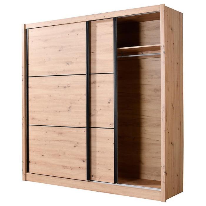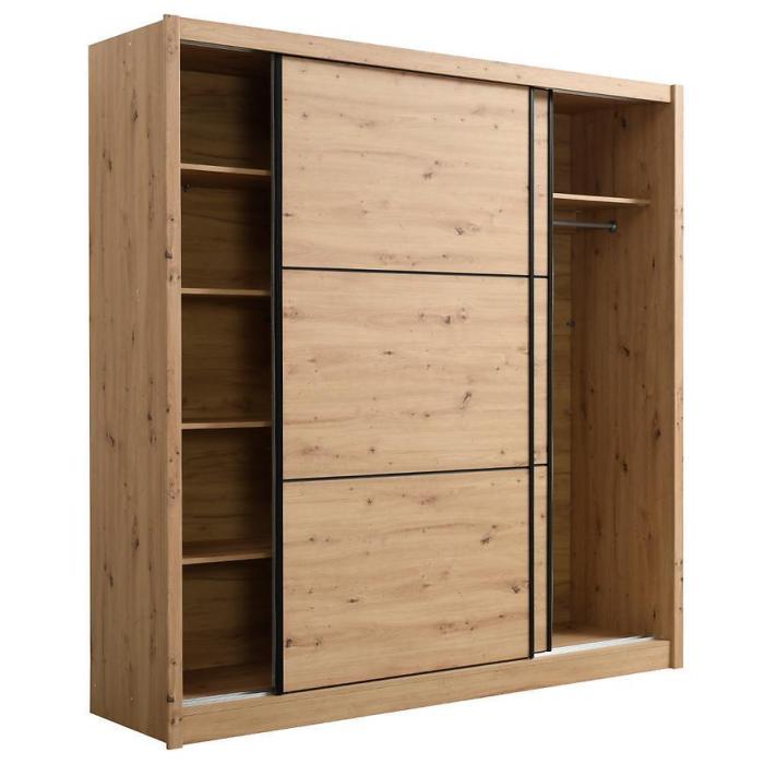 Szafa przesuwna Navara to propozycja do pokoju dziennego, ale znajdzie swoje miejsce również w innym pomieszczeniu, jak na przykład - przedpokój czy garderobie. Materiał wykonania to płyta wiórowa laminowana. Szafa posiada półki oraz drążek na ubrania. Nowoczesny styl mebli wpadnie do gustu każdemu, kto poszukuje eleganckiego, klasycznego, a zarazem nowoczesnego umeblowania. Idealnie wpasuje się w większość aranżacji. Przeznaczona do samodzielnego montażu.