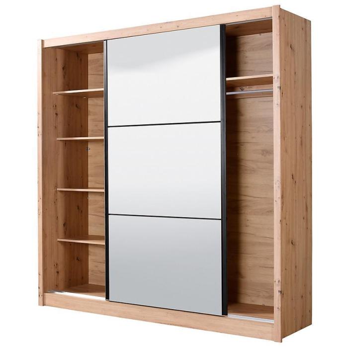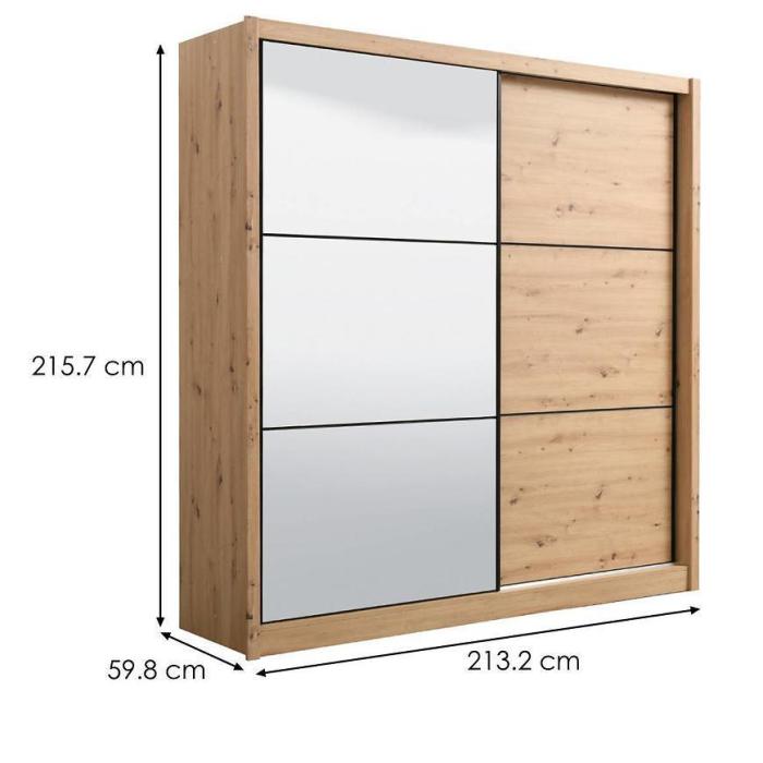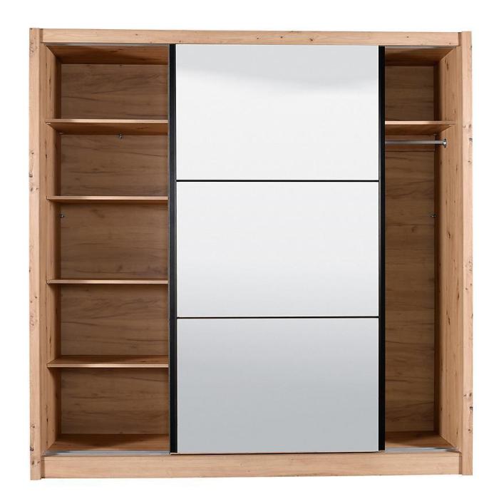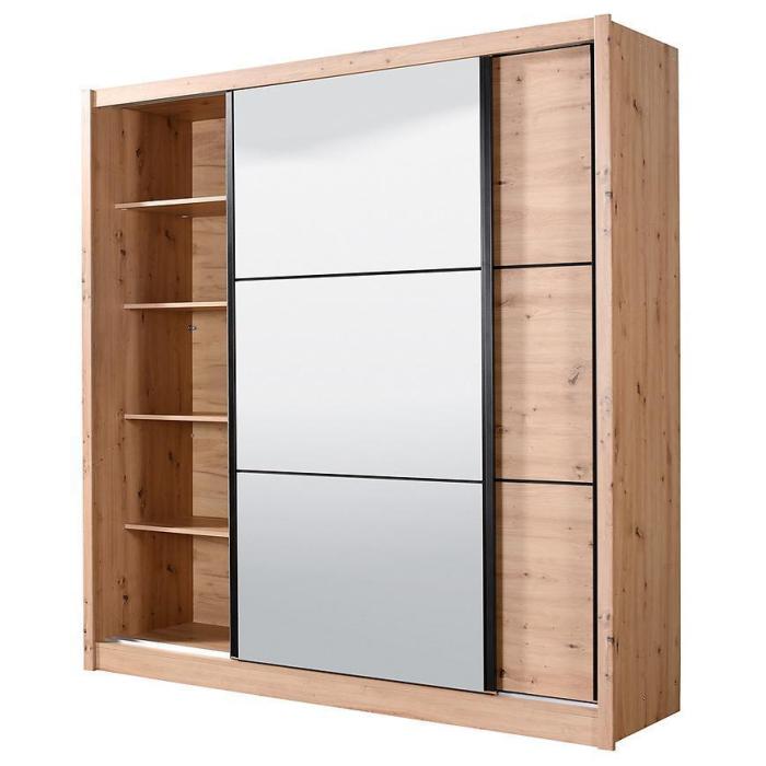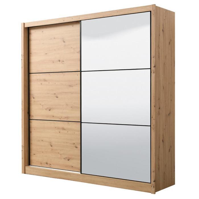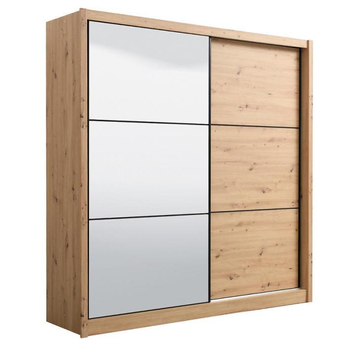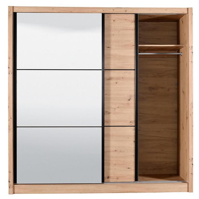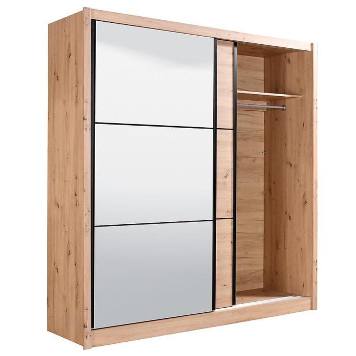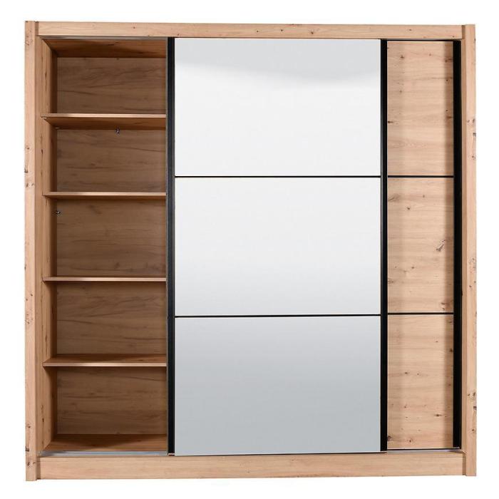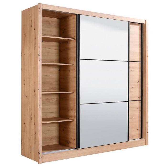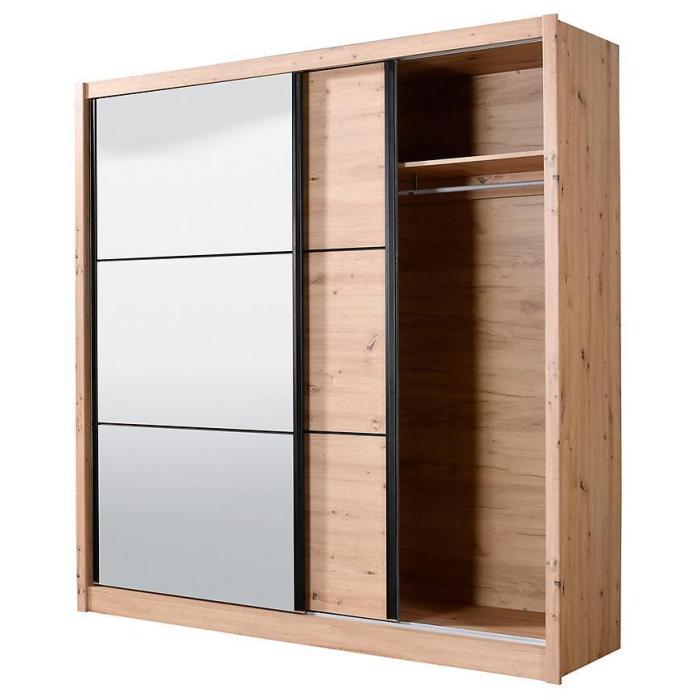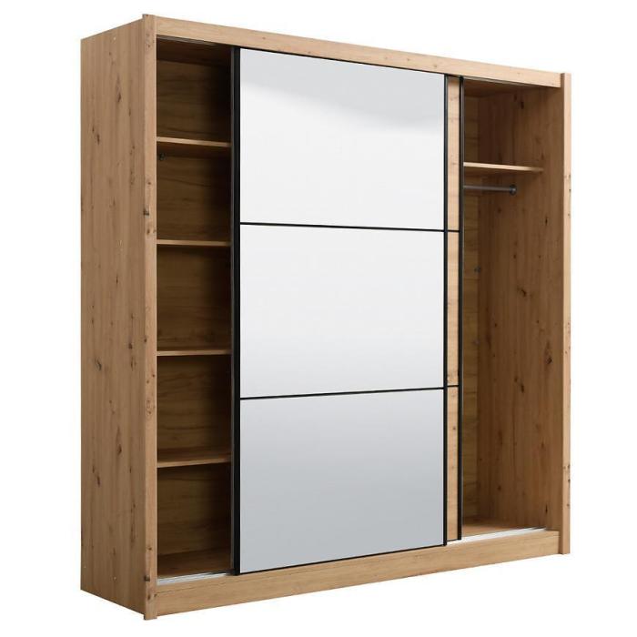 Szafa przesuwna Navara to propozycja do pokoju dziennego, ale znajdzie swoje miejsce również w innym pomieszczeniu, jak na przykład - przedpokój czy garderobie. Materiał wykonania to płyta wiórowa laminowana. Szafa posiada półki oraz drążek na ubrania. Mebel posiada lustro, które sprawi, że pomieszczenie stanie się optycznie większe. Nowoczesny styl mebli wpadnie do gustu każdemu, kto poszukuje eleganckiego, klasycznego, a zarazem nowoczesnego umeblowania. Idealnie wpasuje się w większość aranżacji. Przeznaczona do samodzielnego montażu.