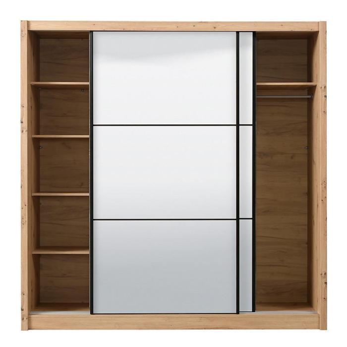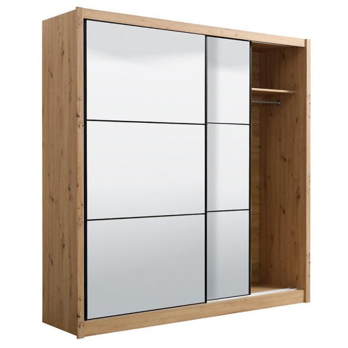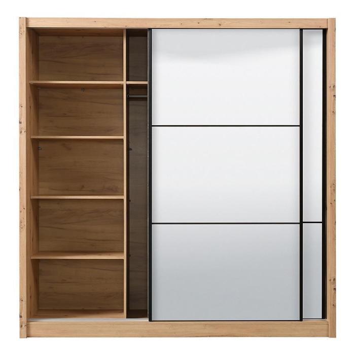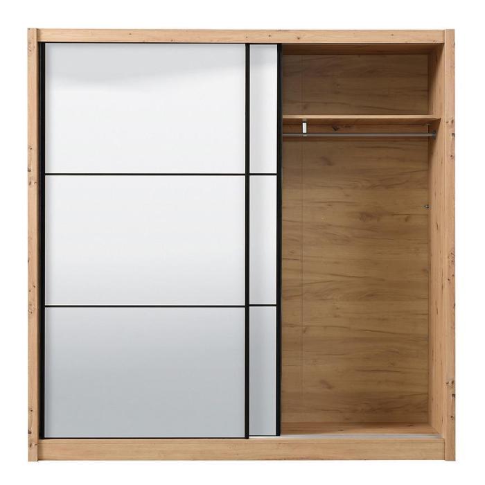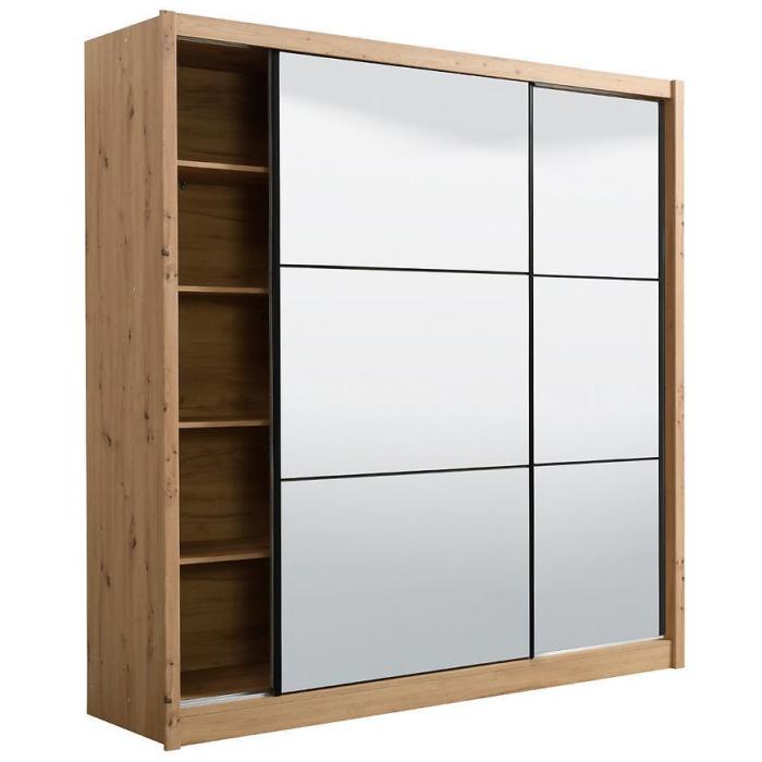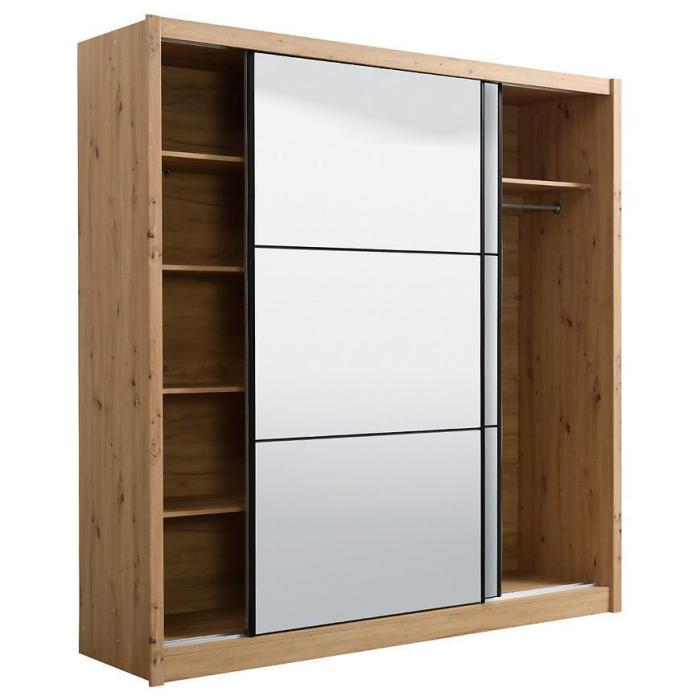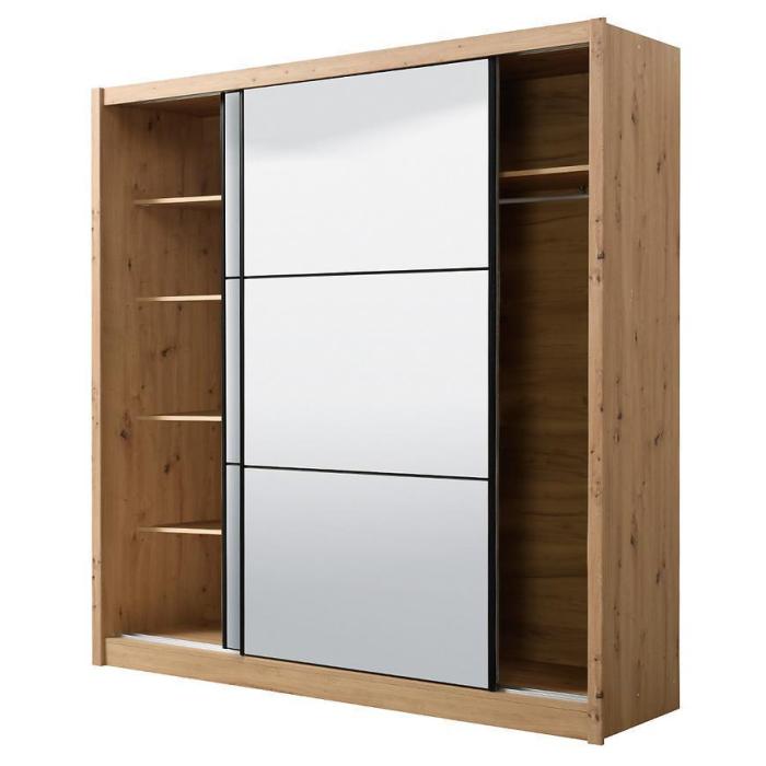 Szafa przesuwna Navara to propozycja do pokoju dziennego, ale znajdzie swoje miejsce również w innym pomieszczeniu, jak na przykład - przedpokój czy garderobie. Materiał wykonania to płyta wiórowa laminowana. Szafa posiada półki oraz drążek na ubrania. Mebel posiada lustro, które sprawi, że pomieszczenie stanie się optycznie większe. Nowoczesny styl mebli wpadnie do gustu każdemu, kto poszukuje eleganckiego, klasycznego, a zarazem nowoczesnego umeblowania. Idealnie wpasuje się w większość aranżacji. Przeznaczona do samodzielnego montażu.